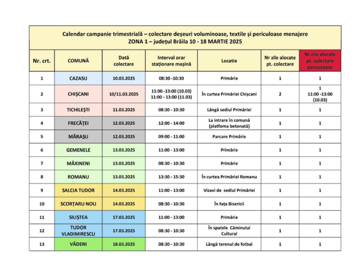 Începând de luni, 10 martie, până marțea viitoare, 18 martie, operatorul de salubritate Polaris M Holding SRL, în calitate de lider al Asocierii și PHG Waste Management SRL (Asociat), în parteneriat cu ADI Eco Dunărea Brăila, derulează campania trimestrială de colectare gratuită a deșeurilor voluminoase, textile și a celor periculoase menajere în toate comunele din Zona 1 din Județul Brăila. Este vorba despre Cazasu, Chiscani, Frecăței, Gemenele, Mărașu, Măxineni, Romanu, Salcia Tudor, Scorțaru Nou, Siliștea, Tichilești, Tudor Vladimirescu, Vădeni.