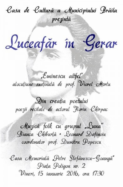 Vineri, 15 ianuarie 2016, de la ora 17.30, la Casa de Cultură a Municipiului Brăila va avea loc un eveniment cultural în memoria lui Mihai Eminescu, marele poet romantic, geniu al lirismului românesc, de la a cărui naştere se împlinesc 166 de ani.