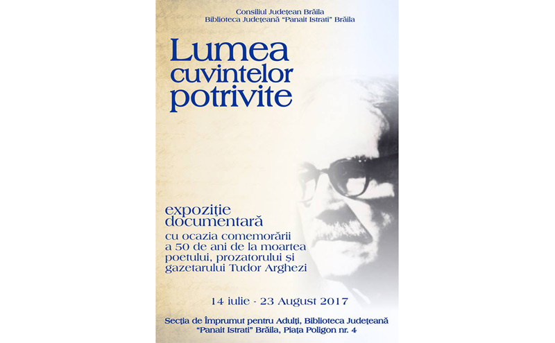 Biblioteca Judeţeană “Panait Istrati” Brăila organizează, de la jumătatea lunii iulie şi până pe data de 23 august, în cadrul Secţiei de Împrumut pentru Adulţi, expoziţia documentară, “Lumea cuvintelor potrivite”, marcând astfel 50 de ani de la moartea poetului, prozatorului şi gazetarului Tudor Arghezi.