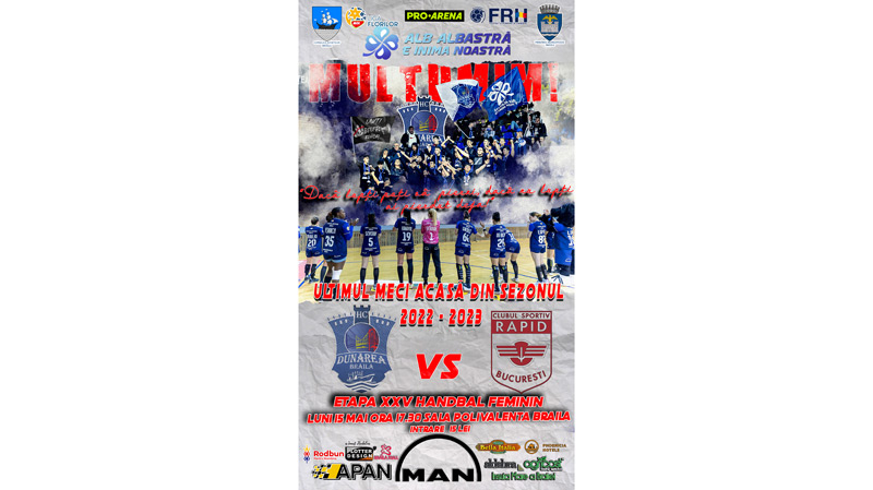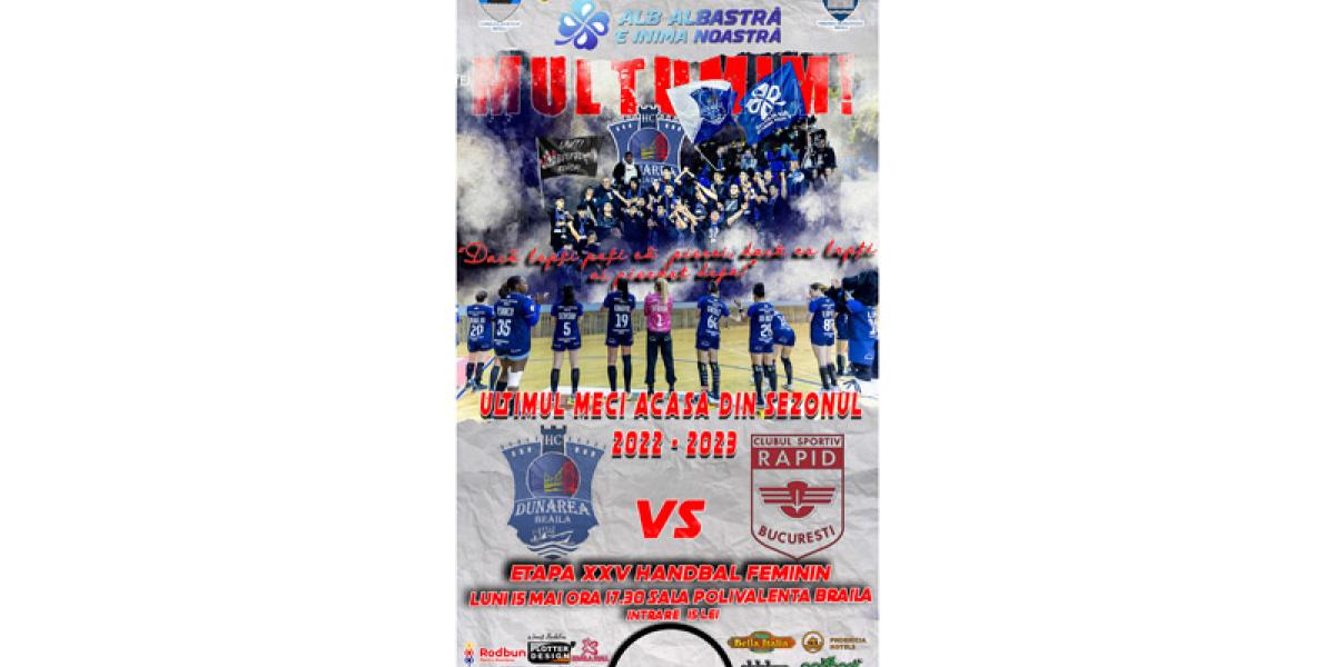 Campionatul Ligii Florilor, ediția 2022-2023, se apropie de final. Luni, 15 mai, în etapa a 25-a, de la ora 17.30, HC Dunărea va juca ultimul său meci din acest sezon pe teren propriu, adversară fiind Rapid București.