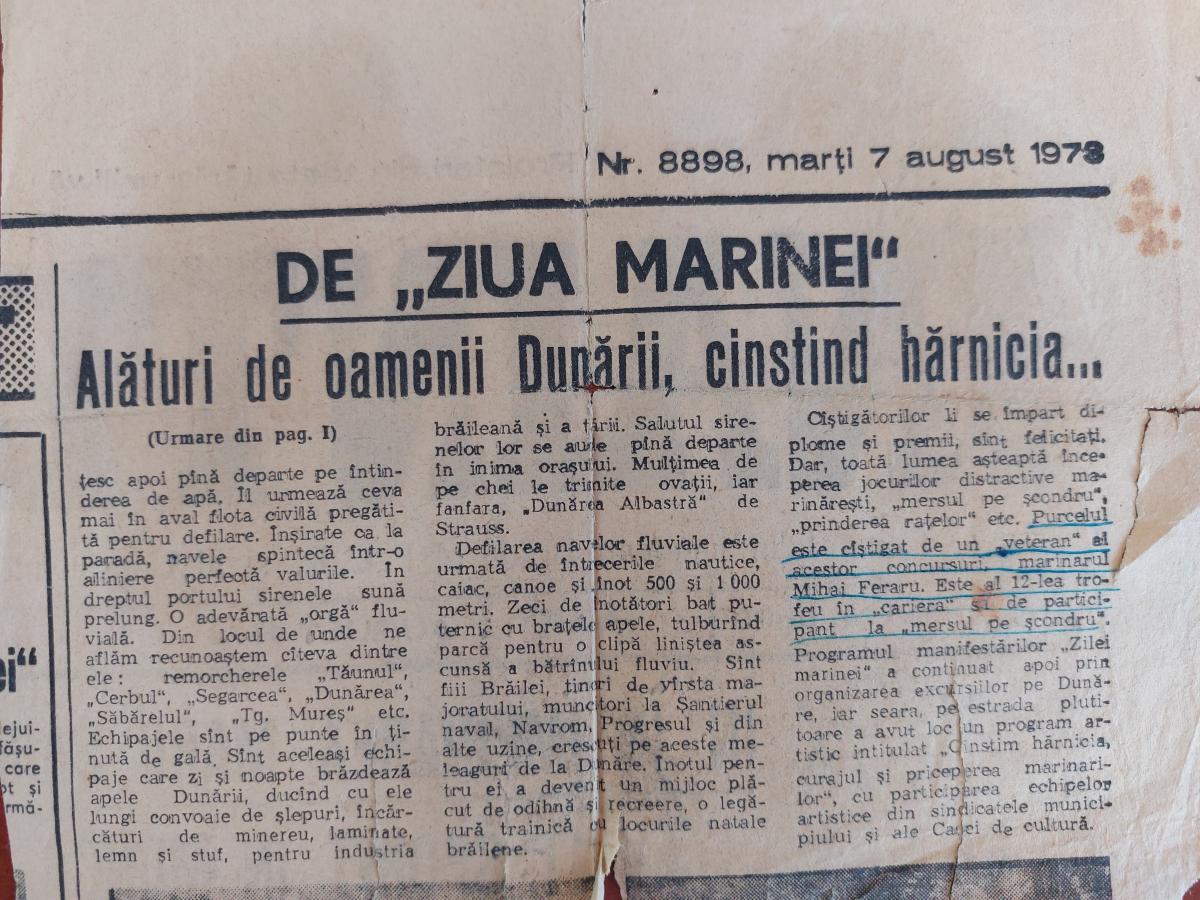 De mai bine de șase decenii, Mihai Feraru, omul care a învățat marinăria de la părinții săi și pe care apusul vieții l-a prins pe Dunăre, spintecând valurile cu nava „Lacu Sărat”, a fost și a rămas un învingător. A străbătut toată Europa pe fluviu, de la Sulina și până la Regensburg, în Germania Federală, a câștigat „porcul la școndru” de mai bine de 20 de ori, încă de pe vremea lui Dej, și a trăit momentul decembrie 1989, împreună cu familia, pe „Severnav”, în Portul Brăilei, sub ploaia de gloanțe care au făcut ciur structura navei pe care se adăposteau și care le era și casă. N-ai să vezi un om mai optimist și mai plin de umor ca Mihai Feraru, marinarul albit de ani, care zâmbește chiar și atunci când povestește cum era să fie răpus de gloanțe când a picat regimul comunist. Și măcar dacă ar fi avut și dumnealui un „certificat de revoluționar”!...