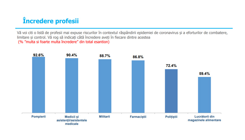 “În această perioadă de criză excepţională, dar şi de vulnerabilitate a populaţiei, nivelul de încredere în profesiile cele mai expuse este uriaş. Medicii şi asistentele medicale, farmaciştii, pompierii, militarii, poliţiştii se bucură de niveluri record de încredere multă şi foarte multă din partea populaţiei, ceea ce evidenţiază atât teama puternică a opiniei publice, cât şi nevoia oamenilor de a se racorda la repere de stabilitate şi profesionalism care pot acorda ajutor şi se află în linia întâi a bătăliei cu epidemia de coronavirus. Chiar şi lucrătorii din magazinele alimentare beneficiază de un nivel de încredere foarte ridicat de aproximativ 60%”, susţine Remus Ştefureac, director INSCOP Research: