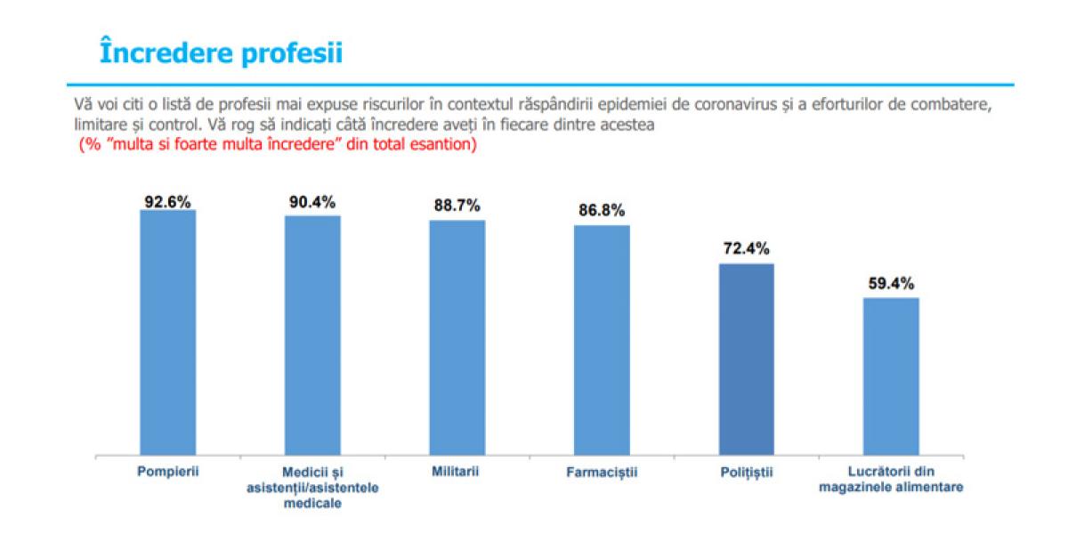 În lupta cu COVID-19, ce profesii se bucură de încrederea populaţiei? La această întrebare au încercat să afle răspunsul cei de la compania de cercetare sociologică INSCOP Research, care au realizat un sondaj de opinie privind percepţia populaţiei cu privire la epidemia de coronavirus. Astfel, la capitolul încrederea în profesiile cele mai expuse în lupta cu COVID-19, de cea mai mare încredere în această perioadă se bucură pompierii, medicii şi asistentele medicale, cu 92,6% încredere multă şi foarte multă, respectiv 90,4% încredere multă şi foarte multă. Urmează militarii cu un procent de 88,7%, farmaciştii cu 86,8% şi poliţiştii cu 72,4%. Lucrătorii din magazinele alimentare se numără şi ei printre profesiile în care au încredere, cu un procent de 59,4%.