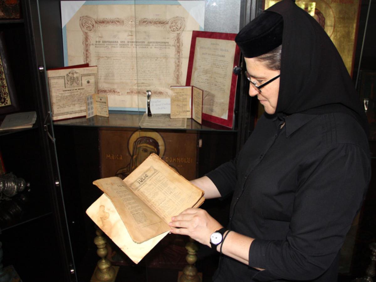 Deşi nu îngăduie să-şi asume această realizare, iniţiativa înfiinţării acestui muzeu îi aparţine, maica Iustina fiind, de altfel, şi cea care a căutat şi a pus cap la cap obiectele donate de pelerini, le-a restaurat şi, acolo unde a fost cazul, a confecţionat cu mâinile sale o parte din decorul muzeului. Din acest decor, face parte şi un cufăr, de peste 150 de ani, cu care doamnele, în vechime, mergeau cu diligenţa la Paris, dar şi încă 3.000 de alte obiecte ce spun poveşti de altădată. Sunt mărturii ce datează, în mare parte, de peste 100 de ani, donate fie de oameni de bună credinţă, fie găsite, pur şi simplu, în magazii, ori prin poduri de case ori beciuri, şterse de praf, restaurate şi expuse la loc de cinste, în lumina muzeului Mănăstirii Lacu Sărat. Dintre acestea fac parte şi ştergare, peretari şi costume tradiţionale, cărţi, icoane, obiecte de uz casnic din gospodăriile anilor 1.800-1.900, dar şi acte de stăpânire de la 1875. Dintre cele mai vechi şi preţioase obiecte pe care le găsim aici fac parte şi o oală din lut în care se purta borşul la muncile câmpului, veche de peste 160 de ani, dar şi o masă şi un scaun de aceeaşi vârstă. Din rândul frumoaselor exponate mai face parte şi un epitaf din secolul 19, ce ilustrează scena Pogorârii de pe cruce, un obiect care ar fi fost găsit de un poliţist din Brăila şi care a decis să-l dea în grija maicilor de la Lacu Sărat. Tot aici, un loc aparte îl ocupă şi un almanah al satelor de la 1914, în care sunt poezii dedicate familiei regale, dar şi înscrisuri ale acesteia pe care maica Iustina l-a primit în dar de la un enoriaş. În restul timpului, pe maica Iustina o găsim în atelierul de croitorie al mănăstirii, unde coase cât e ziua de lungă veşminte bisericeşti. Face asta de 11 ani, de când femeia şi-a găsit liniştea la Mănăstirea Lacu Sărat, aici unde, spune ea, a fost ajutată şi încurajată să se exprime liber şi să amenajeze acest muzeu aşa cum crede de cuviinţă. O idee născută din pasiune pentru folclor, care a fost hrănită de-a lungul timpului ca o îndatorire faţă de trecut, faţă de strămoşi, după cum o descrie maica Iustina, iar asta se vede şi în picturile sale pe lemn, o altă pasiune a maicii cu care îşi hrăneşte sufletul ori de câte ori are ocazia. De altfel, la interior, biserica este decorată cu peste 70 de icoane pictate de un artist brăilean, lucrări care vin să completeze o veritabilă colecţie de 9 icoane ce datează din secolul 19, expuse în muzeul mănăstirii.