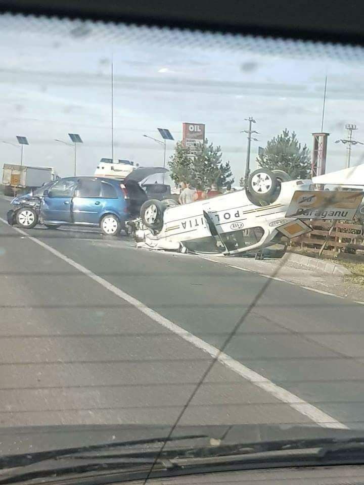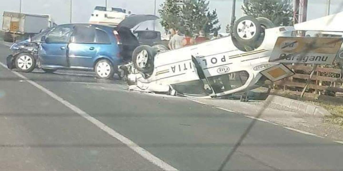 Autospecială de poliţie răsturnată pe şosea din cauza unui şofer care nu a acordat pioritate. Evenimentul s-a produs la intrare în localitatea Bărăganul.
