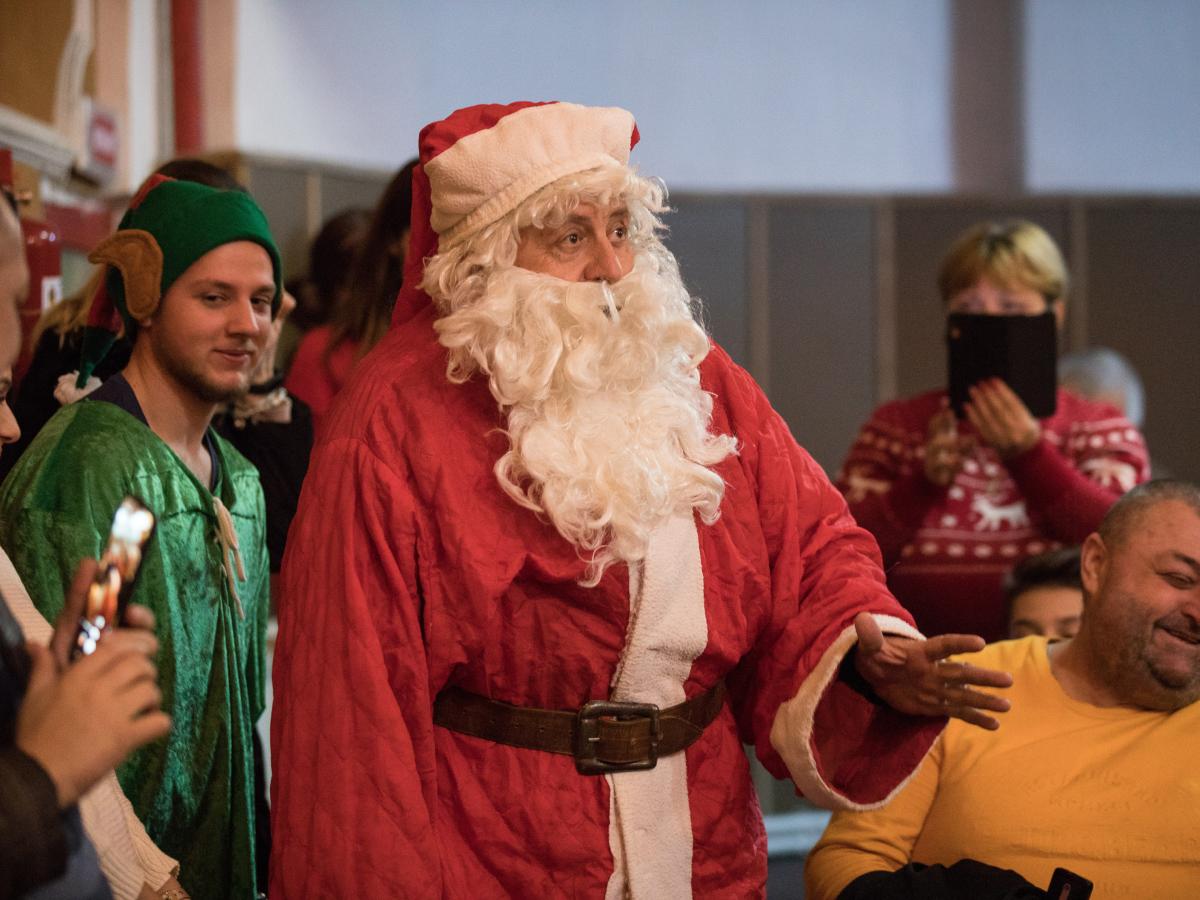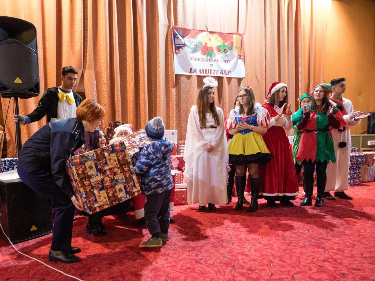 Spectacolul de dans s-a încheiat tocmai la fix, atunci când cel mai simpatic bătrânel a ajuns la serbare. În sală au început să se audă chicote de bucurie. La fel ca anul trecut, Moşul şi-a respectat promisiunea şi a venit să le împartă cadourile micuţilor mai puţin norocoşi din municipiul şi judeţul Brăila. A urcat pe scenă, i-a salutat pe toţi cu tradiţionalul “Ho, ho, ho!” şi le-a spus piticilor cât de mult se bucură şi el să îi vadă. Şi, deşi ştie foarte bine cine a fost cuminte şi cine a mai făcut şi boroboaţe, Moş Crăciun îi iubeşte pe toţi copiii în mod egal şi le-a pregătit tuturor cadouri de poveste! Şi uite aşa, rând pe rând, fiecare copil a urcat pe scenă şi şi-a primit cadoul de la Moş. Unele erau atât de grele, încât cei mici abia dacă le puteau cuprinde cu braţele, însă “spiriduşii” noştri i-au ajutat să le care până la locul din sală. După ce au fost împărţite toate darurile, Moşul a plecat, dar nu înainte de a le spune copiilor că va veni şi la anu', cu daruri şi mai bogate.