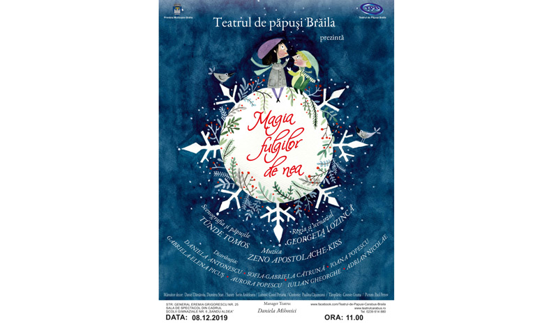 Duminică, 8 decembrie 2019, de la ora 11:00 la Teatrul de Păpuşi Brăila va avea loc premiera piesei “MAGIA FULGILOR DE NEA”. Regia şi scenariul spectacolului- Georgeta LOZINCĂ, scenografie şi păpuşi- Tunde TOMOS, muzică- Zeno APOSTOLACHE-KISS.