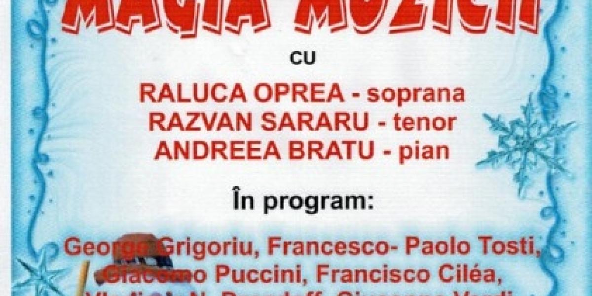 Astăzi, 23 decembrie, la sala de spectacole a Societăţii Filarmonice "Lyra" are loc concertul "Magia Muzicii", cu soprana Raluca Oprea, tenorul Răzvan Săraru şi Andreea Bratu la pian. În program sunt incluse cântece din repertoriul românesc şi internaţional, dar şi colinde şi cântece de petrecere. Evenimentul este prezentat de Daniela-Carmen Vlad, iar intrarea este liberă.