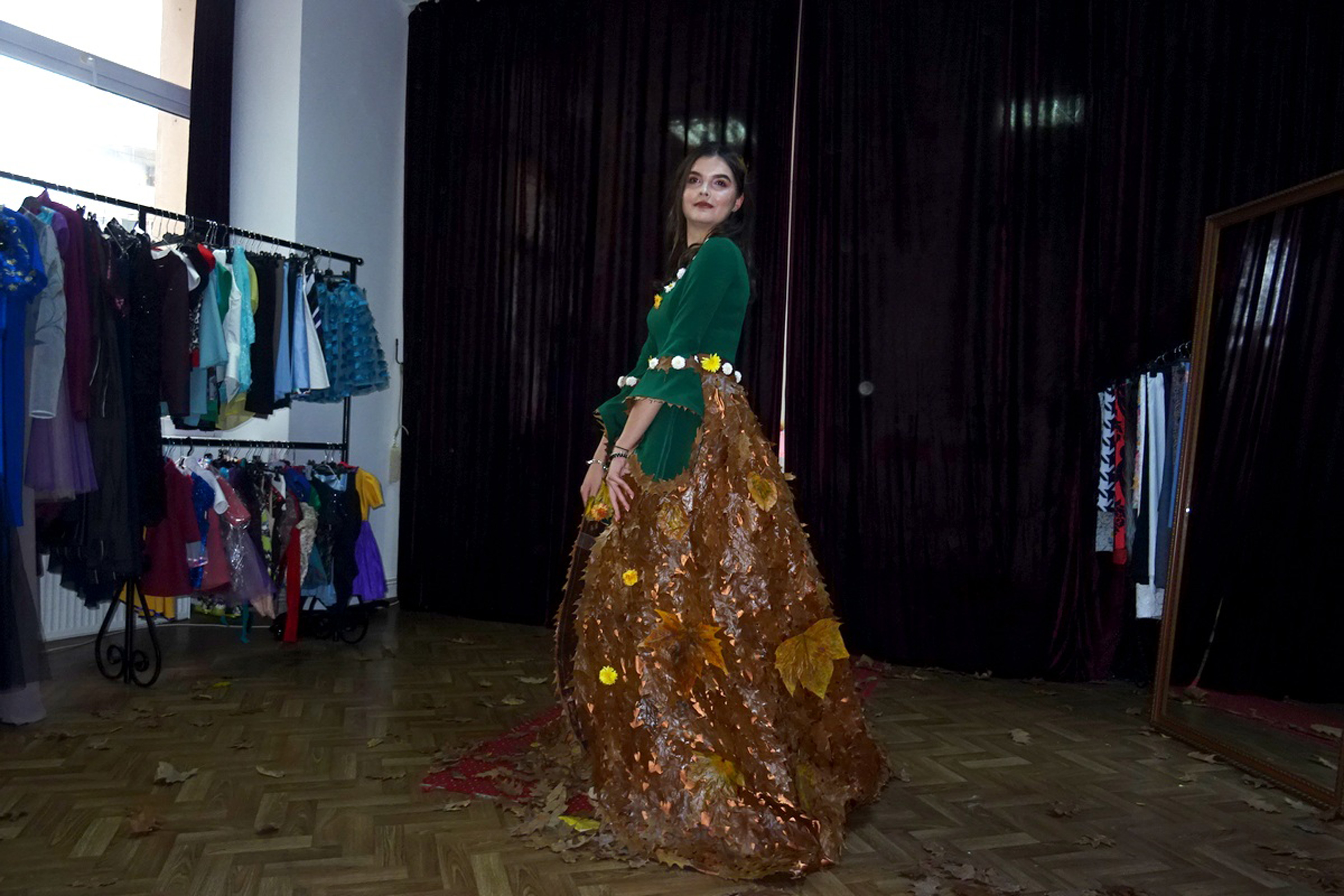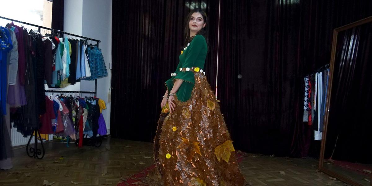 • tânăra brăileancă Raluca Constantin ne surprinde cu o nouă rochie spectaculoasă, confecţionată din frunze uscate de tei şi stejar • aceasta a lucrat la ţinută câteva zile şi a folosit peste 1.000 de frunze