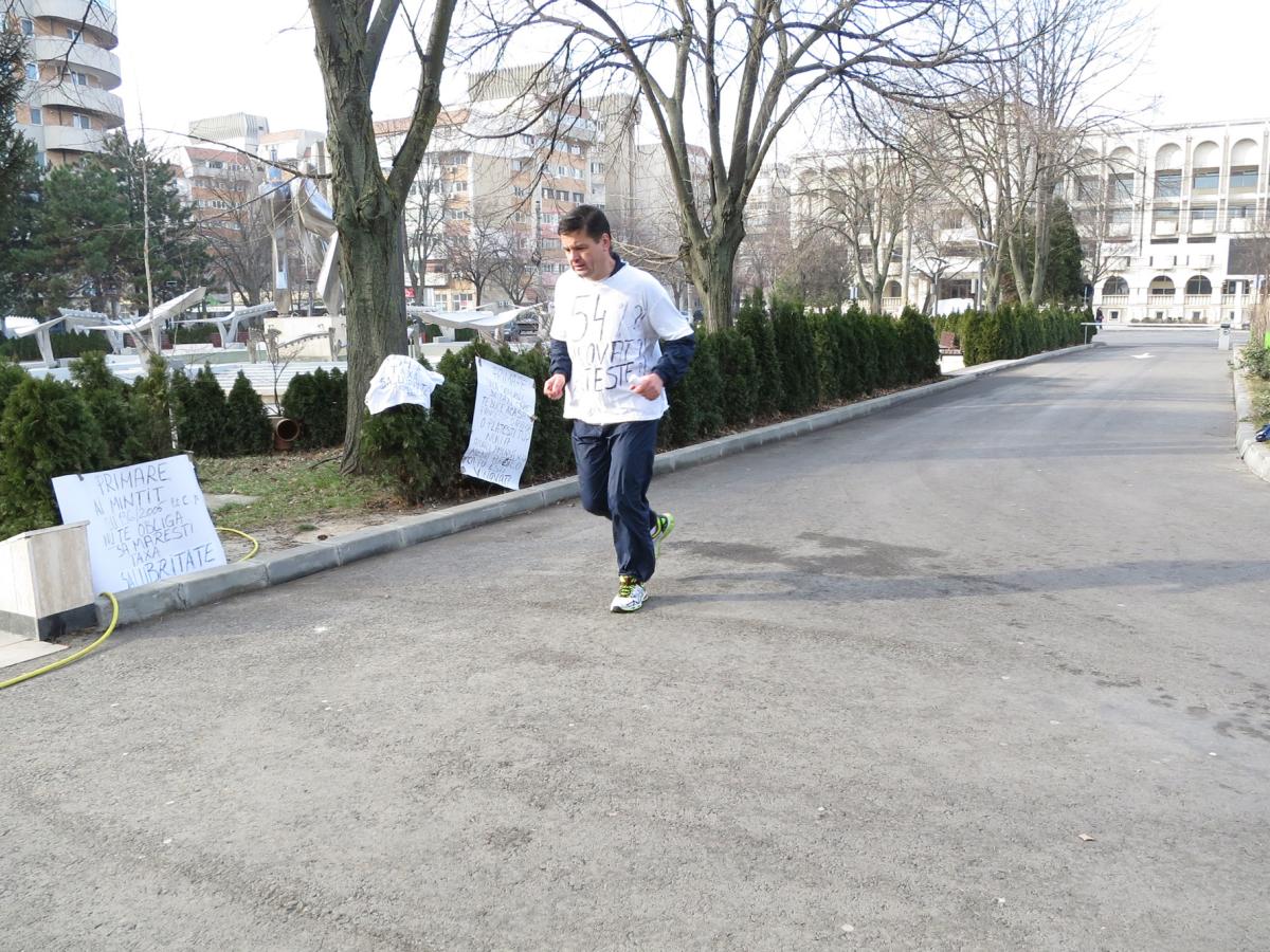 Costel Mărgărit protestează într-un mod inedit. Omul aleargă zilnic în cerc, pe drumul care permite accesul maşinilor în parcarea de la Primărie şi încearcă să atragă atenţia trecătorilor cu un fluier. Şi-a adus două pancarte pentru a-şi expune mesajul şi poartă un tricou alb pe care, de asemenea, a scris mesaje pentru a-şi arăta nemulţumirea vizavi de majorarea taxei pentru gunoi.