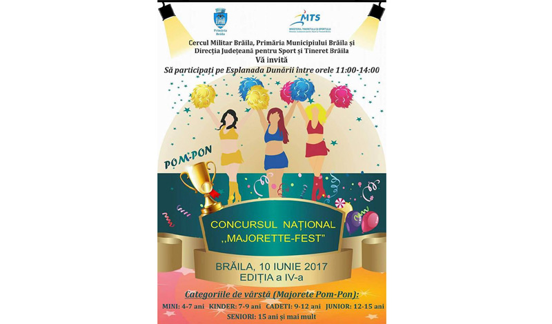 Sâmbătă, 10 iunie, pe Esplanada Dunării, are loc concursul anual “Majorette-fest”, în cadrul căruia cele mai talentate majorete din ţară se întrec în paşi de dans şi fluturat pompoane. Cea de-a IV-a ediţie a competiţiei organizată de Cercul Militar Brăila, Primăria Municipiului Brăila şi Direcţia Judeţeană pentru Sport şi Tineret Brăila se va desfăşura în intervalul orar 11.00 - 14.00.