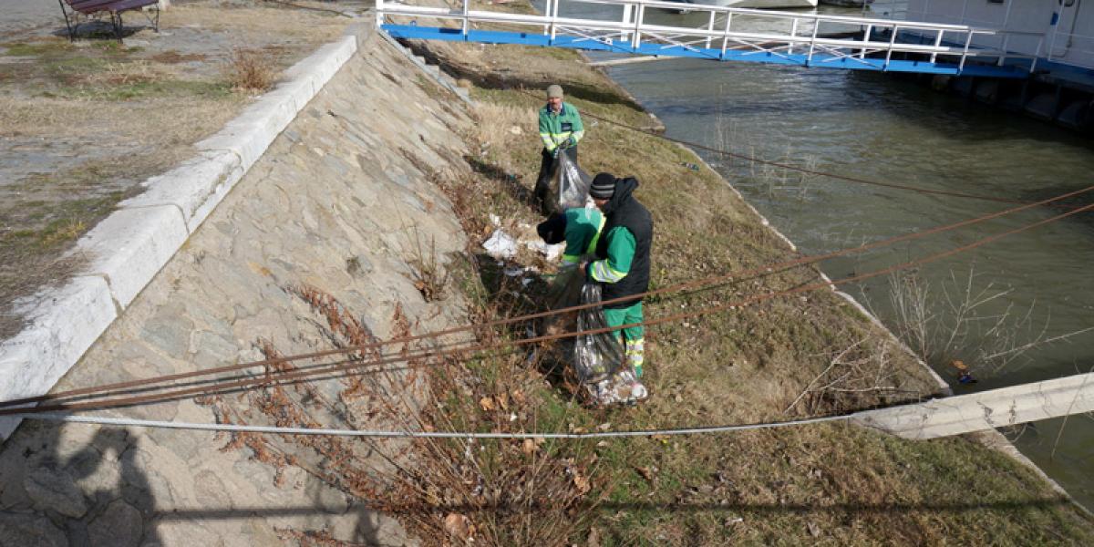 • ieri, o echipă a firmei RER a adunat câțiva saci de deșeuri doar de pe o porțiune de câțiva zeci de metri de mal, din dreptul fostei Gări Fluviale • reprezentanții operatorului de salubritate ne-au explicat că acțiunea de ieri a fost făcută benevol, deoarece curățenia ar fi trebuit făcută de Apele Române, instituția care administrează malul fluviului