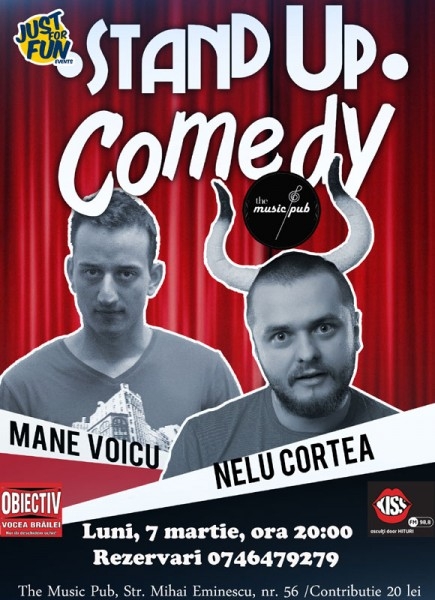 Luni, 7 martie, de la ora 20.00, scena de la The Music Pub găzduieşte o seară de comedie cu Nelu Cortea şi Mane Voicu, doi dintre tinerii actori care fac spectacole de Stand Up Comedy.