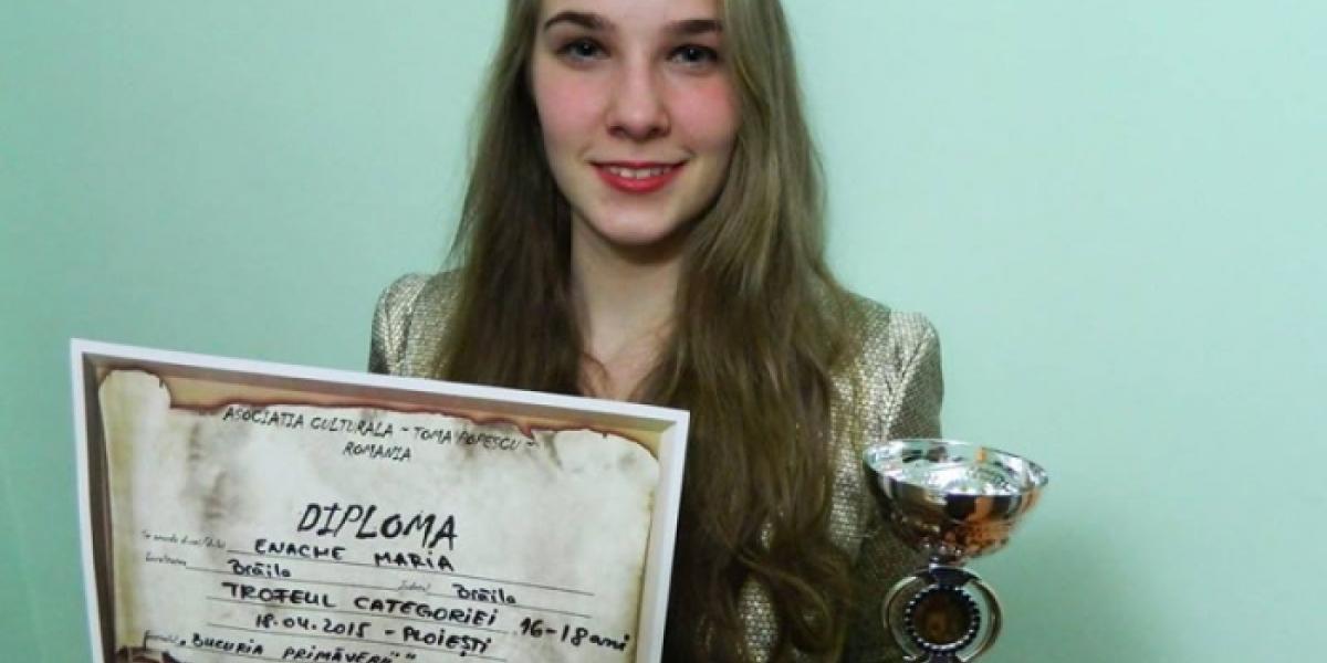 În urmă cu câteva zile s-au stins acordurile celei de-a doua ediţii a Festivalului de muzică uşoară "Bucuriile primăverii" de la Ploieşti. Trofeul la grupa de vârstă 16 - 18 ani a fost cucerit de brăileanca Maria Enache, membră a grupului "Steluţe dunărene", coordonat de prof. Liliana Toader. "Am hotărât să particip doar cu solista Maria Enache, această categorie fiind extraordinar de grea, toţi fiind foarte bine pregătiţi, dar Maria a fost foarte bună, concentrându-se şi făcând o figură frumoasă. Sunt foarte bucuroasă că ea păşeşte cu dreptul către profesionalism", a declarat Liliana Toader.