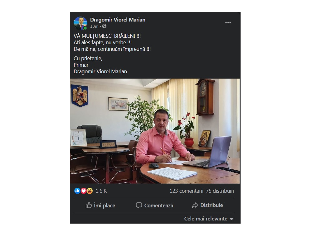 ” VĂ MULȚUMESC, BRĂILENI!!! Ați ales fapte, nu vorbe!!! De mâine, continuăm împreună!!! Cu prietenie, Primar Dragomir Viorel Marian”, a scris acesta pe rețelele de socializare.