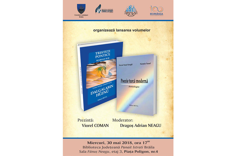 Biblioteca Judeţeană “Panait Istrati” Brăila va găzdui miercuri, 30 mai 2018, începând cu ora 17.00, o dublă lansare de carte: antologia „Poezie turcă modernă” de Nevzat Yusuf Sarigöl şi volumul „Tristeţi pontice” (Dalgalarin Hüznü) de Marian Ilie.