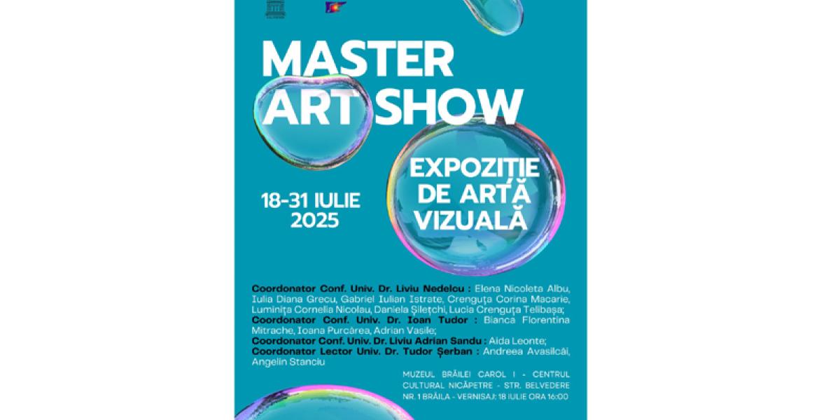 Vineri, 18 iulie, de la ora 16:00, la Centrul Cultural Nicăpetre, de pe Strada Belvedere nr. 1 (Casa Embiricos) din cadrul Muzeului Brăilei „Carol I”, va avea loc vernisajul Expoziției MASTER ART SHOW, un proiect artistic captivant care reunește pe simeze lucrările absolvenților Programului de studii Master - Pictură de la Facultatea de Arte a Universității „Dunărea de Jos” din Galați. Fiecare artist se prezintă cu un stil distinct și o viziune proprie asupra artei, ne explică organizatorii evenimentului cultural.