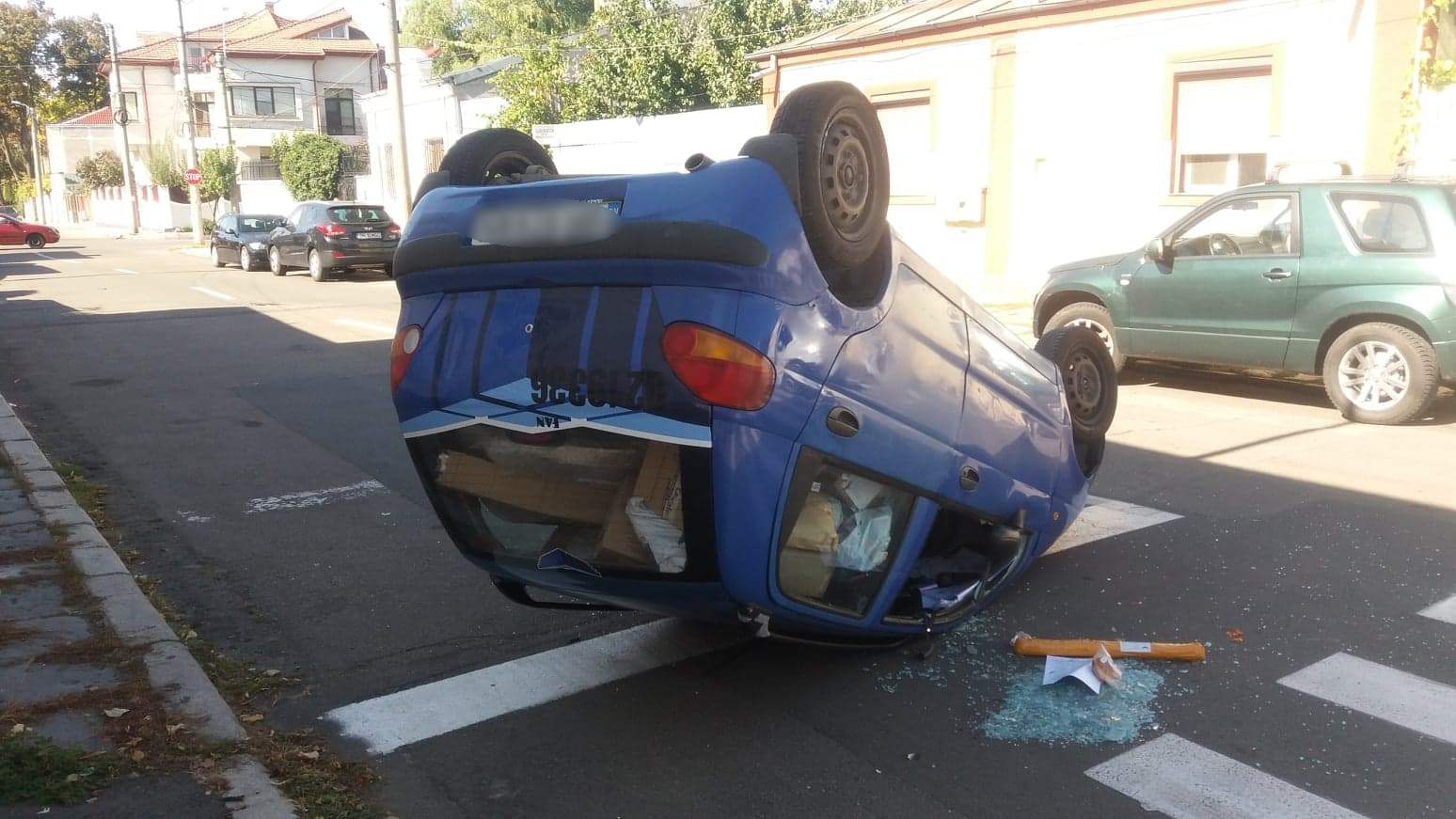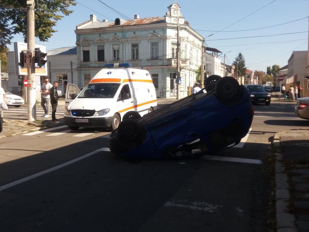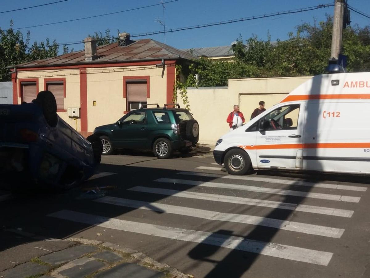 Un accident rutier s-a produs, în urmă cu puțin timp, la intersecția Bulevardului Cuza cu strada N. Bălcescu, din cauza unui șofer neatent. Un auto Matiz s-a răsturnat.