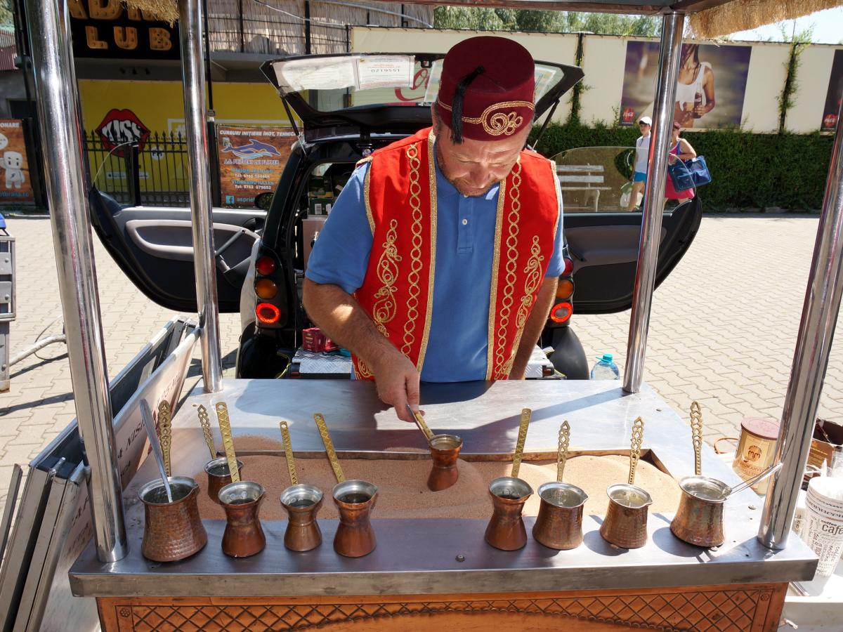 E-o încântare să-ți petreci după-amiaza pe malul Dunării, când se mai potolește căldura, în compania meșterilor populari și a creatorilor de frumos veniți la târg. Primjăria a promis că, de data aceasta, nu o să mai fie fumul înecăcios, care-ți tăia respirația, al nenumăratelor grătare. În schimb, poți să-ți alinți papilele gustative cu o cafea de calitate, făcută la nisip, de Iulius Iancu, ploieșteanul îmbrăcat turcește. Din două fraze, te convinge să bei nu una, ci două cafele făcute în vestitul ibric de cupru. "Cafeaua preparată așa este deosebită prin faptul că fierbe în nisip, la propriu, pe toată suprafața ibricului, care este, întotdeauna, din cupru. În plus cafeaua conține cardamon, un condiment arăbesc care-i îmbunătățește calitățile", ne spune cafegiul cu fes, din Ploiești. Cum să reziști tentației?