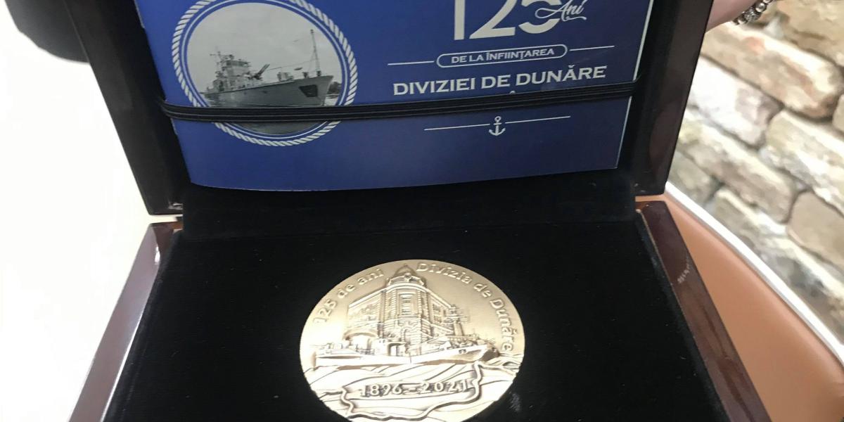 Emisă de către Regia Autonomă Monetăria Statului, în ediție limitată, medalia aniversară „125 de ani de la înființarea Diviziei de Dunăre” a fost concepută, precizează organizatorii evenimentului „ca arc peste timp din anul 1896 până în anul 2021, stilizând pe fațetele sale patru elemente importante ale dezvoltării structurii fluviale a Forțelor Navale Române”. Pe una din fațete se află bustul marelui om politic Mihail Kogălniceanu, cel care a sintetizat importanța Dunării pentru poporul român prin cuvintele „Cheia mântuirii noastre este drumul Dunării spre Marea largă deschisă tuturor”.