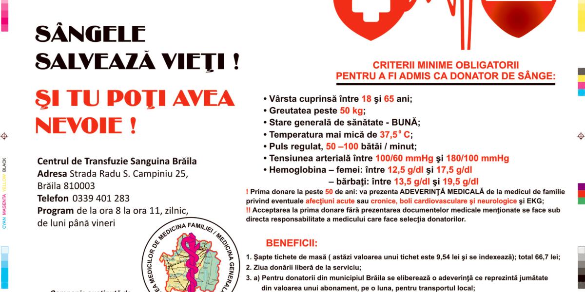 În contextul în care numărul donatorilor de sânge s-a diminuat extrem de mult în ultima perioadă, iar necesarul zilnic nu mai poate fi acoperit, Societatea Medicilor de Familie Brăila a pornit o campanie de informare şi sensibilizare a populaţiei. Prin acest demers se urmăreşte convingerea brăilenilor să meargă la Centrul de Transfuzie Sanguină Brăila şi să facă un act de caritate pentru semenii suferinzi, care au foarte mare nevoie de sânge.