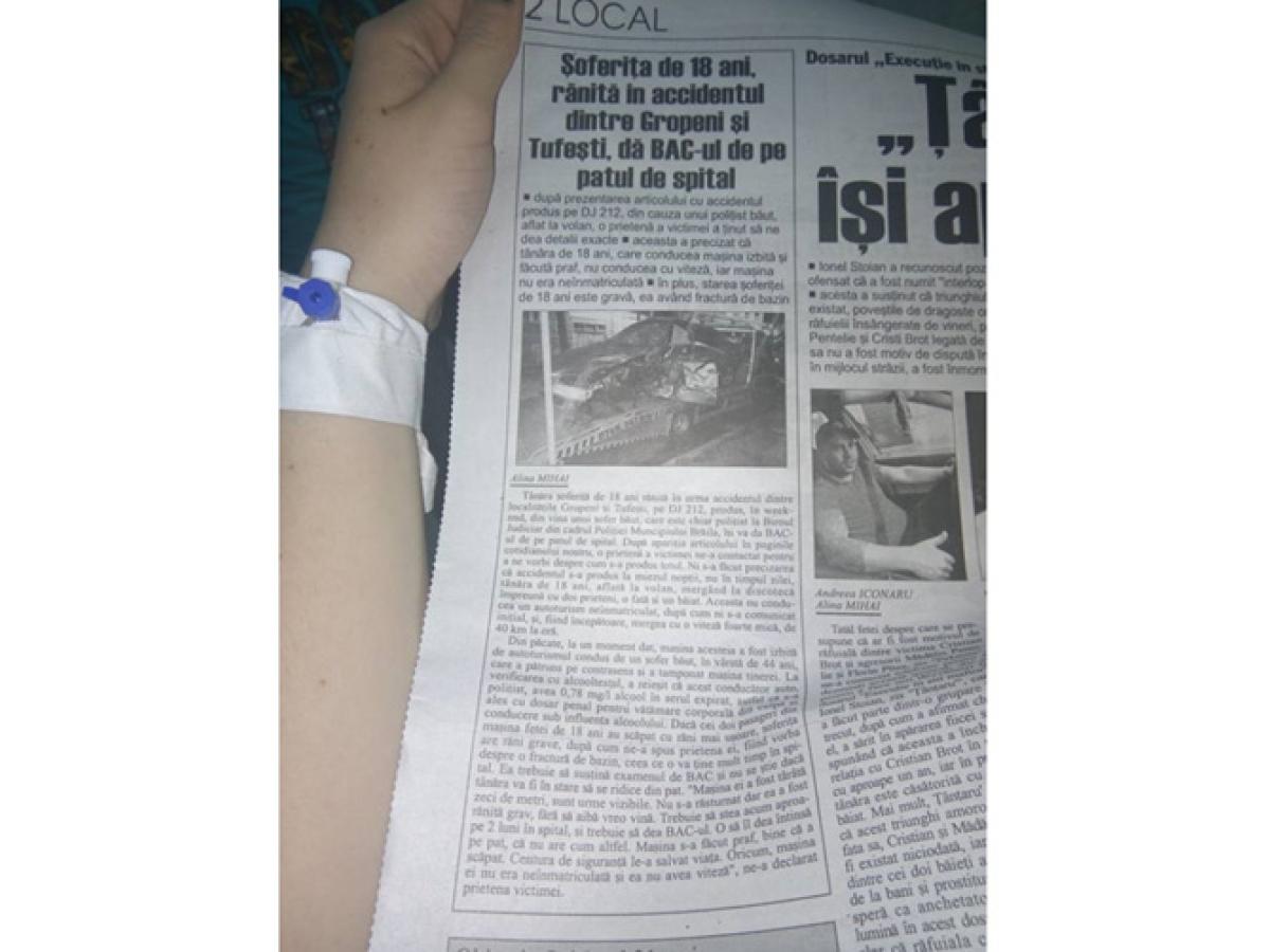 După cum v-am informat anterior, accidentul dintre localităţile Gropeni şi Tufeşti (pe DJ 212), s-a produs chiar din vina şoferului băut, după cum au stabilit poliţiştii care au efectuat cercetarea la faţa locului, vinovatul fiind poliţist de la Biroul Judiciar din cadrul Poliţiei Muncipiului Brăila. Accidentul s-a produs la miezul nopţii, tânăra de 18 ani, aflată la volan, mergând la discotecă împreună cu doi prieteni, o fată şi un băiat. Din păcate, la un moment dat, maşina acesteia a fost izbită de autoturismul condus de un şofer băut, în vârstă de 44 ani, care a pătruns pe contrasens şi a tamponat maşina tinerei. Potrivit poliţiştilor, la verificarea cu alcooltestul, a reieşit că acest conducător auto avea 0,78 mg/l alcool în aerul expirat, astfel că s-a ales cu dosar penal pentru vătămare corporală din culpă şi conducere sub influenţa alcoolului. Dacă cei doi pasageri din maşina fetei de 18 ani au scăpat cu răni mai uşoare, şoferiţa a suferit leziuni grave. Totuşi, încă de atunci prietenii au fost convinşi că ea va da examenul de Bac. “Trebuie să stea acum aproape 2 luni în spital, şi trebuie să dea BAC-ul. O să îl dea întinsă pe pat, că nu are cum altfel. Dar o să-l dea!”, a spus, după accident, o prietenă a victimei.