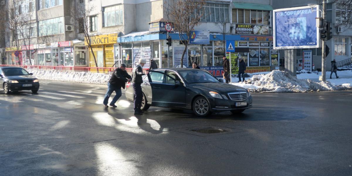 Incident miercuri dimineață, în jurul orei 10.30, când un autoturism Mercedes a rămas în pană chiar în mijlocul intersecției străzii 1 Decembrie 1918 cu strada Griviței, la Piața Mare, într-o poziție care încurca serios traficul. Prima reacție a multor șoferi a fost, evident, să claxoneze și probabil să înjure obstacolul neașteptat pe care trebuia să-l ocolească fiecare cum se pricepea mai bine. Nu se poate spune că a apărut un blocaj propriu-zis în trafic, dar mașina oprită în mijlocul intersecției încurca serios circulația. După ce a devenit evident că există o problemă și că Mercedesul la volanul căruia se afla o femeie nu se poate mișca din loc, doi bărbați au încercat să îl împingă, însă au constatat că mașina are cutie automată, iar roțile erau blocate. O mașină de Poliție care trecea întâmplător prin zonă a tras pe dreapta, iar agenții au mers să vadă ce se întâmplă. Unul dintre ei s-a urcat la volanul Mercedesului, în locul doamnei care efectiv nu știa ce să facă pentru a porni motorul. Polițistul a încercat și el să dea o cheie, dar fără succes. Între timp, a trecut pe acolo și o mașină a unei firme private de pază, care de asemenea a oprit, iar unul dintre agenți a încercat la rândul său să pornească Mercedesul blocat, dar tot degeaba. Circulația din intersecție se desfășura în continuare cu dificultate. Claxoanele sunau, nervozitatea unora dintre șoferi era evidentă. Te-ai fi așteptat ca echipajul de Poliție să rămână la fața locului, pentru a ajuta cumva la fluidizarea traficului până la mutarea mașinii stricate din intersecție și pentru a detensiona situația dacă vreun participant la trafic și-ar fi vărsat nervii pe femeia rămasă cu mașina în drum. Că sloganul Poliției Române este ”Siguranță și încredere”! Surprinzător, însă, agenții îmbrăcați în uniforma statului s-au urcat în mașina de Poliție și au plecat. Or fi avut vreo misiune mai importantă în desfășurare, n-avem de unde să știm... Din fericire pentru ghinionista șoferiță, agenții de la firma privată de pază s-au dovedit a fi mult mai săritori. Aceștia și-au chemat colegii în ajutor, iar o altă mașină a aceleiași firme a oprit în fața Mercedesului - evident spre nemulțumirea unor șoferi care vociferau că li s-a blocat calea - a conectat cablurile speciale la baterie, iar problema s-a rezolvat. Mercedesul a pornit și intersecția a fost deblocată. ”Am oprit ca să ajut! Nu trebuie să fim oameni?!”, i-a răspuns agentul firmei de pază unui trecător care l-a întrebat dacă o cunoștea dinainte pe doamna de la volanul mașinii stricate sau a oprit pur și simplu când a văzut mașina blocată în intersecție. La rândul său, șoferița i-a spus unui martor că schimbase bateria autoturismului recent, cu o zi sau două, și că nu își explică ce s-a întâmplat. Între timp, la fața locului a apărut și o persoană cu o baterie nouă, probabil un reprezentant al firmei de la care fusese cumpărată cea defectă.