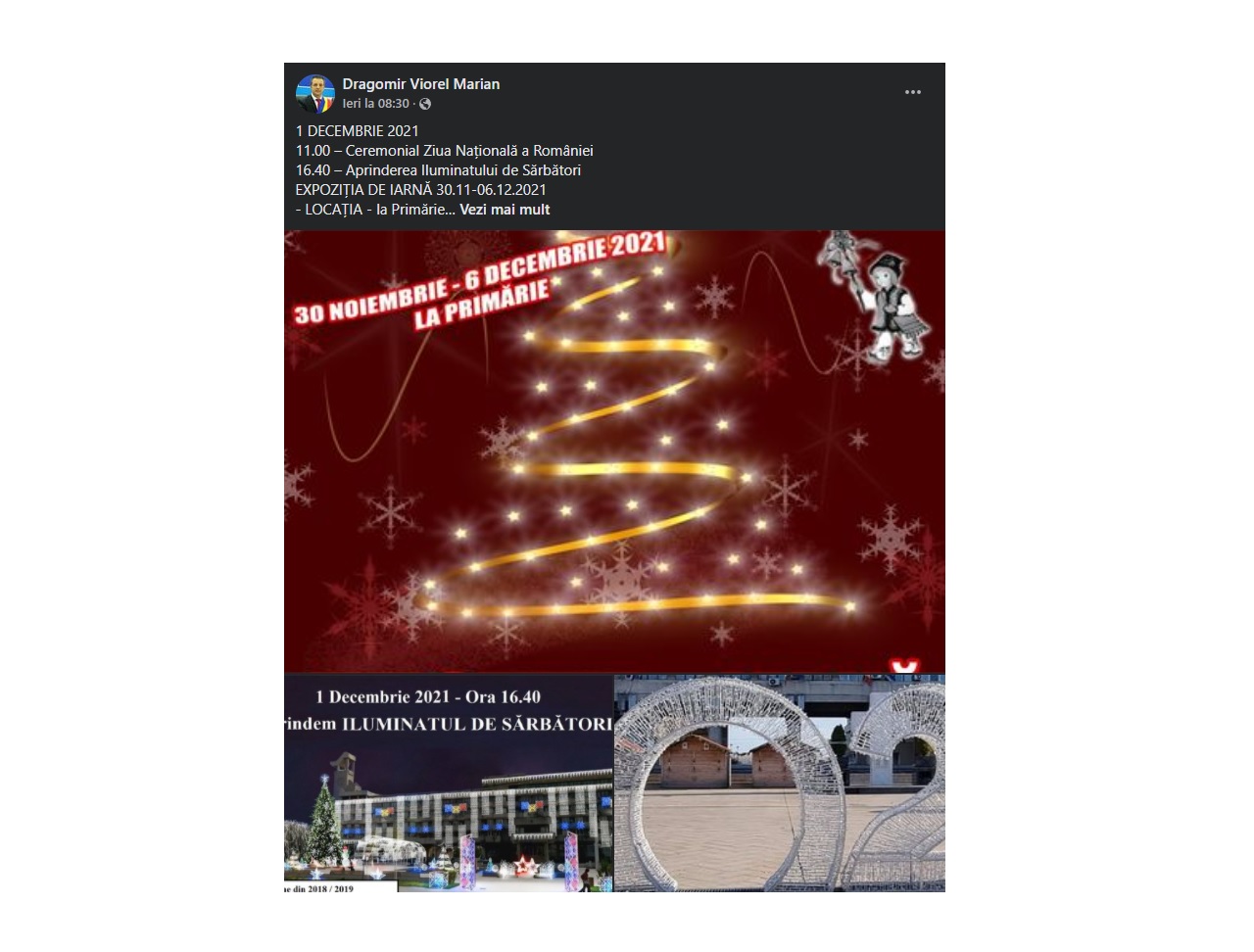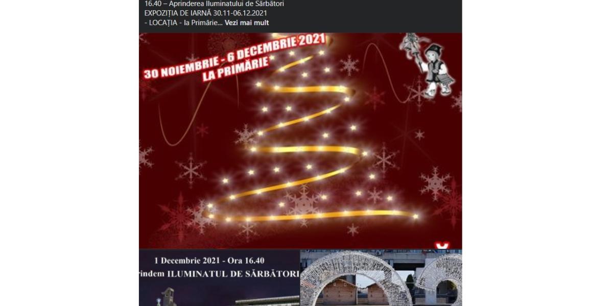 ”1 DECEMBRIE 2021: 11.00 - Ceremonial Ziua Națională a României; 16.40 - Aprinderea Iluminatului de Sărbători. EXPOZIȚIA DE IARNĂ 30.11-06.12.2021: LOCAȚIA - la Primărie; BILET ACCES - 0 (ZERO) LEI - «moda anului 2021» este ca primăriile din alte orașe să taxeze accesul (inclusiv al copiilor mai mari de 12 ani) la Târgurile de Crăciun. Noi nu organizăm Târg de Crăciun ci Expoziție de Iarnă!!! Și nu taxăm pe nimeni!!! ACCESUL - Liber, necondiționat de certificat deoarece este organizată doar Expoziție de Iarnă cu vânzare”, a declarat Dragomir.