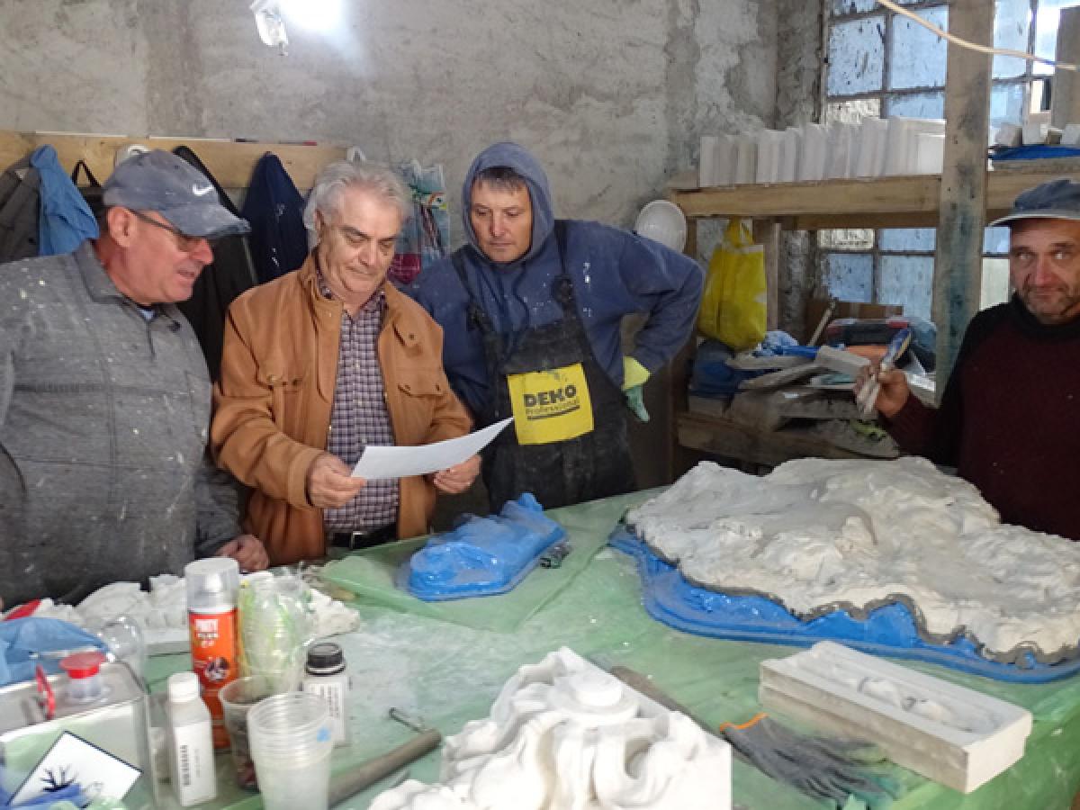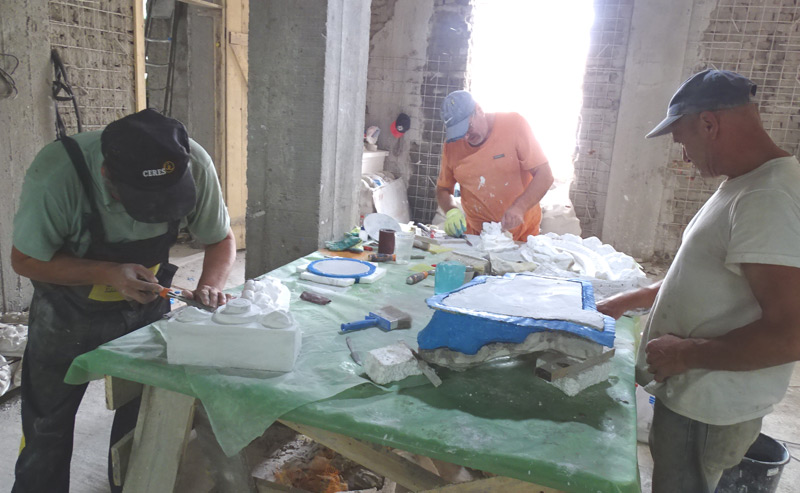 Să revenim, însă, acolo unde este mândru de cei “patru băieți ai săi”, care, cu pasiune și multă pricepere, readuc la viață excepționalele ornamente ale clădirii de la sfârșitul secolului XIX. Ei sunt de vârste diferite și total dedicați meseriei: Marin Minea, Costel Negoiță, Ionel Samson și Vasile Duțu. “Lucrez cu ei de 7-8 ani; știu exact ce au de făcut și ne consultăm mereu ce materiale ne trebuie, care este consumul și ce cheltuială are de făcut proprietarul clădirii, mai ales acum, de la apariția valului de scumpiri apărut și în construcții. Primează însă calitatea, trăinicia lucrului făcut și perfecțiunea punerii în operă a unor materiale moderne, de bună calitate. Ritmul de lucru este unul realist, fără “hei–rup”, oamenii beneficiază gratuit de o masă și apă la discreție, acționând după norme locale, cu maximum de seriozitate și disciplină. Mai ales că, potrivit proverbului, este mai ușor să construiești o casă decât să repari una veche și cu tot felul de neprevăzute. Refolosim la zidărie ceea ce este rezistent, iar în ceea ce privește restaurarea detaliilor arhitecturale, procesul este unul laborios și de maximă precizie. Atât la desprinderea ornamentelor (foarte fragile) cât și la realizarea, perfect identică, a altora noi. Se curăță, se spală și fotografiază fragmentele desprinse și se realizează mulaje și matrițe din silicon. Urmează apoi umplerea acestora cu un mixt de materiale foarte rezistent în timp (peste 100 de ani) și la intemperii, iar după o săptămână de întărire li se aplică straturi succesive de lac. Pentru ca, în final, perfect și fără nici o fisură, să se aplice pe fațadă noile ornamente, verificate milimetric, de “n” ori”, ne-a declarat meșterul Gurgu. Potrivit acestuia, este vorba despre 380 de elemente, pe o suprafață de 400 metri pătrați: medalioane, console, tăblii și ghirlande ornamentale, rozete, stive, baluștri etc. Cât privește fațada aflată în proces de restaurare, tencuiala are din start încorporată o vopsea adecvată culorii originale a clădirii și pentru a rezista definitiv la intemperii.