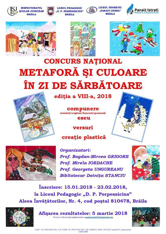 Biblioteca Județeană "Panait Istrati" în parteneriat cu Liceul Pedagogic „D.P. Perpessicius” și Liceul Teoretic „Panait Cerna” organizează Concursul național de creație plastică și literară „Metaforă și culoare în zi de sărbătoare”, ediția a VIII-a, 2018. Tema concursului este „Tradițiile și obiceiurile sărbătorilor religioase Sfântul Nicolae și Nașterea Domnului” / „Iarna”. Concursul se adresează elevilor din învățământul primar, gimnazial, liceal precum și cadrelor didactice care îi îndrumă în realizarea lucrărilor, iar la jurizare se va ține cont de categoria de vârstă a participanților: 8 - 11 ani ; 12 - 15 ani ; 16 -19 ani.