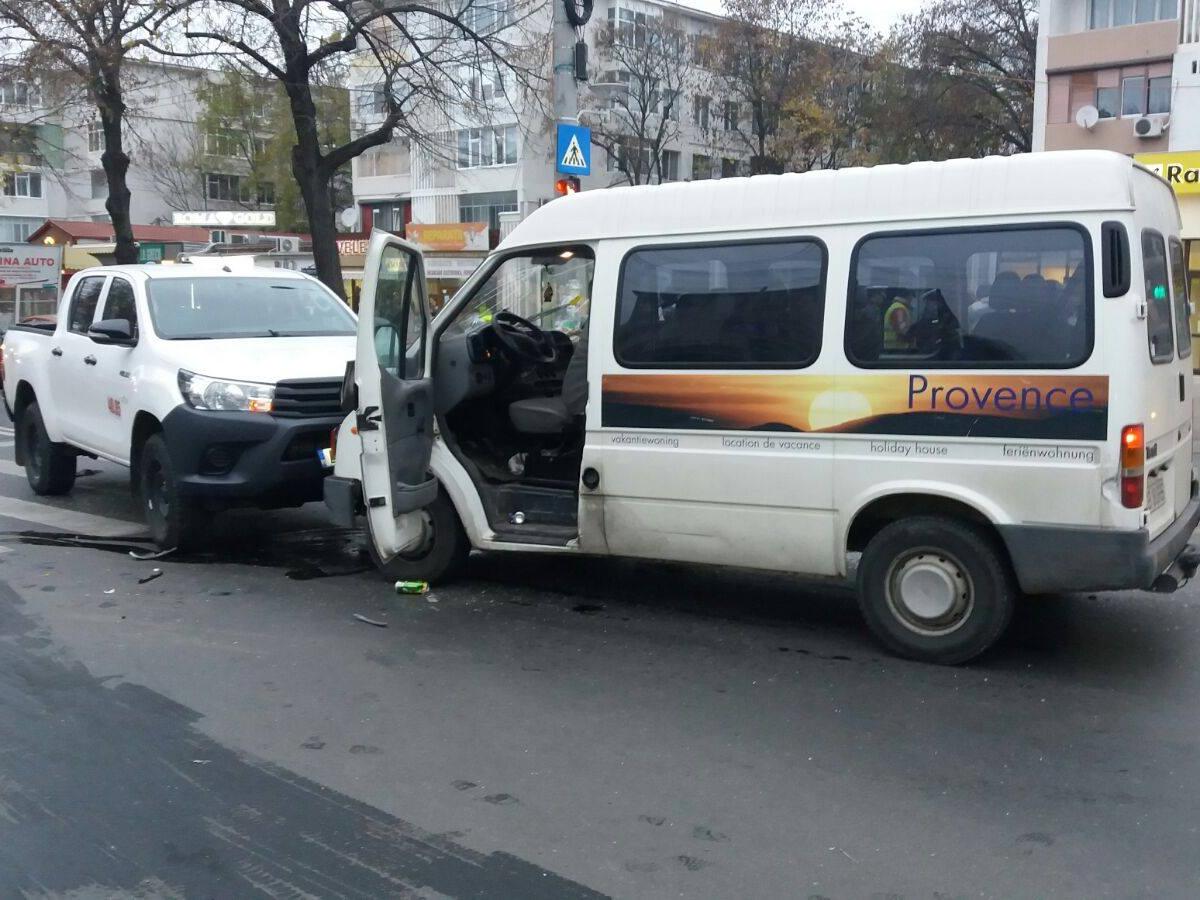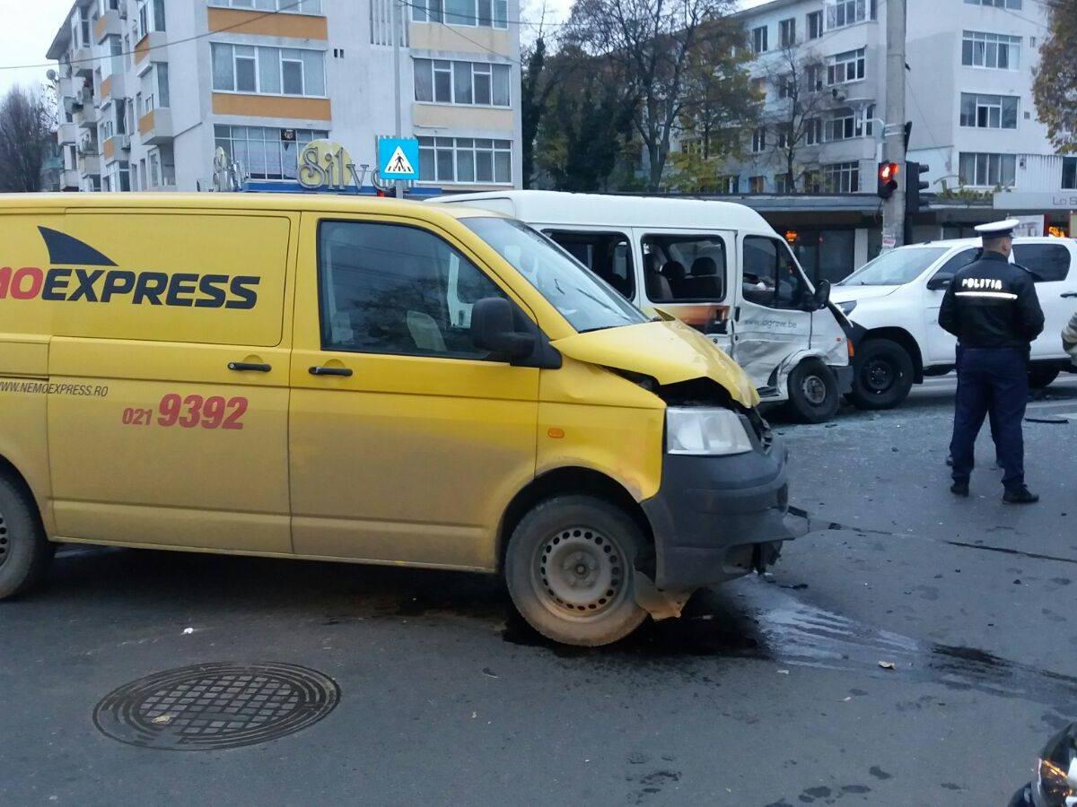 UPDATE: Potrivit poliţiştilor, un tânăr de 20 de ani din judeţul Dâmboviţa se deplasa cu o autoutilitară Ford pe strada 1 Decembrie, iar la intersecţia cu Independenţei nu a acordat prioritate unei alte autoutilitare marca Volkswagen, condusă de un brăilean, de 57 de ani. În urma impactului Ford-ul a ricoşat într-un jeep Toyota, ce venea din sens opus, pe strada 1 Decembrie. Deși, inițial, s-a anunțat că a fost vorba despre trei persoane rănite, în final au ajuns doar două la spital, aflate în microbuzul Ford. Polițiștii au întocmit dosar penal pentru vătămare corporală din culpă.