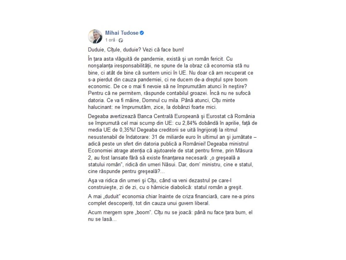 ”În ţara asta vlăguită de pandemie, există şi un român fericit. Cu nonşalanţa iresponsabilităţii, ne spune de la obraz că economia stă nu bine, ci atât de bine că suntem unici în UE. Nu doar că am recuperat ce s-a pierdut din cauza pandemiei, ci ne ducem de-a dreptul spre boom economic. De ce o mai fi nevoie să ne împrumutăm atunci în neştire? Pentru că ne permitem, răspunde contabilul groazei. Încă nu ne sufocă datoria. Ce va fi mâine, Domnul cu mila. Până atunci, Cîţu minte halucinant: ne împrumutăm, zice, la dobânzi foarte mici. Degeaba avertizează Banca Centrală Europeană şi Eurostat că România se împrumută cel mai scump din UE: cu 2,84% dobândă în aprilie, faţă de media UE de 0,35%! Degeaba creditorii se uită îngrijoraţi la ritmul nesustenabil de îndatorare: 31 de miliarde euro în ultimul an şi jumătate - adică peste un sfert din datoria publică a României! Degeaba ministrul Economiei atrage atenţia că ajutoarele de stat pentru firme, prin Măsura 2, au fost lansate fără să existe finanţarea necesară: «o greşeală a statului român», ridică din umeri Năsui. Dar, dom’ ministru, cine e statul, cine răspunde pentru greşeală?”, a postat Tudose pe reţelele de socializare.