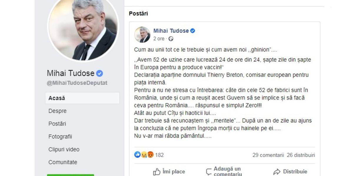 Tudose a pornit de la o declarație recentă a comisarului european Thierry Breton, care a anunțat că există 52 de fabrici în statele europene ce produc deja vaccinuri împotriva COVID-19. Europarlamentarul a criticat lipsa de implicare a Guvernului Florin Cîțu în a încuraja și a sprijini producerea de vaccinuri și la nivelul României. Acesta chiar a dorit să sublinieze că țara noastră produce ”ZERO” vaccinuri anti-COVID.