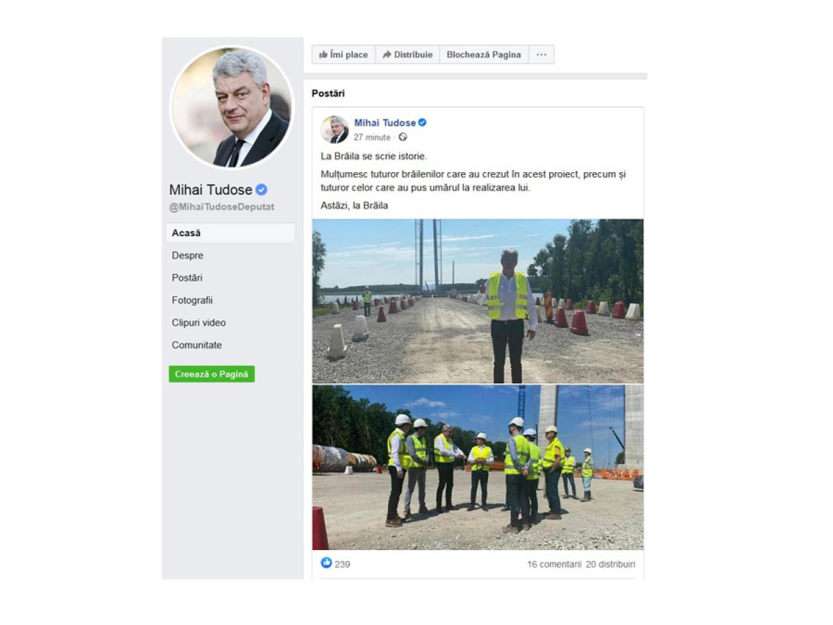 Europarlamentarul Mihai Tudose a vizitat, ieri, șantierul podului suspendat peste Dunăre pentru a vedea stadiul lucrărilor. Social-democratul a efectuat o vizită în teren alături de primarul Municipiului Brăila Marian Dragomir și de președintele Consiliului Județean Francisk Chiriac. Mihai Tudose s-a arătat plăcut impresionat, motiv pentru care chiar a postat un mesaj în acest sens pe rețelele de socializare, alături de câteva fotografii de la fața locului.