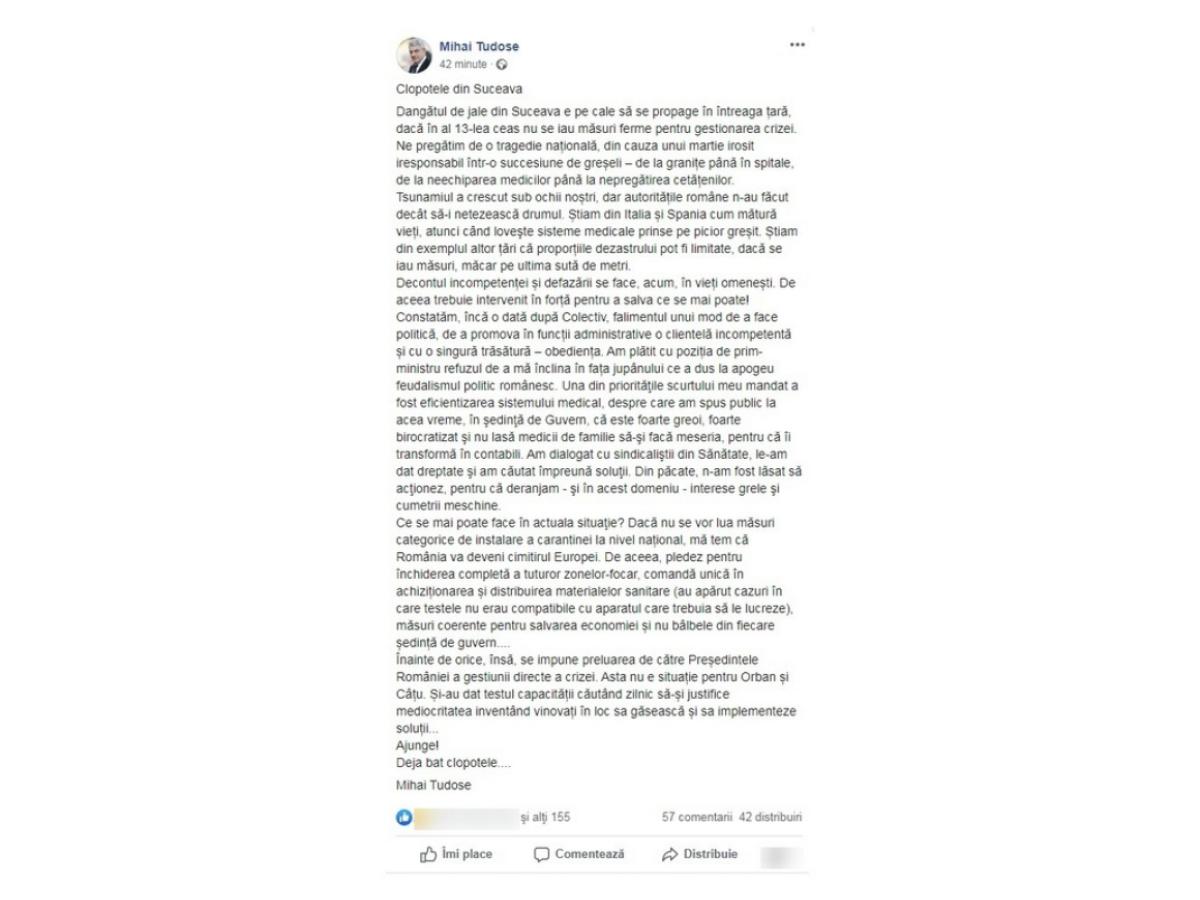”Dangătul de jale din Suceava e pe cale să se propage în întreaga țară, dacă în al 13-lea ceas nu se iau măsuri ferme pentru gestionarea crizei. Ne pregătim de o tragedie națională, din cauza unui martie irosit iresponsabil într-o succesiune de greșeli -de la granițe până în spitale, de la neechiparea medicilor până la nepregătirea cetățenilor. Tsunamiul a crescut sub ochii noștri, dar autoritățile române n-au făcut decât să-i netezească drumul. Știam din Italia și Spania cum mătură vieți, atunci când loveşte sisteme medicale prinse pe picior greșit. Știam din exemplul altor țări că proporțiile dezastrului pot fi limitate, dacă se iau măsuri, măcar pe ultima sută de metri. Decontul incompetenței și defazării se face, acum, în vieți omenești. De aceea trebuie intervenit în forță pentru a salva ce se mai poate! Constatăm, încă o dată după Colectiv, falimentul unui mod de a face politică, de a promova în funcții administrative o clientelă incompetentă și cu o singură trăsătură - obediența. Am plătit cu poziția de prim-ministru refuzul de a mă înclina în fața jupânului ce a dus la apogeu feudalismul politic românesc. Una din priorităţile scurtului meu mandat a fost eficientizarea sistemului medical, despre care am spus public la acea vreme, în şedinţă de Guvern, că este foarte greoi, foarte birocratizat şi nu lasă medicii de familie să-şi facă meseria, pentru că îi transformă în contabili. Am dialogat cu sindicaliştii din Sănătate, le-am dat dreptate şi am căutat împreună soluţii. Din păcate, n-am fost lăsat să acţionez, pentru că deranjam - şi în acest domeniu - interese grele şi cumetrii meschine”, a declarat Tudose.