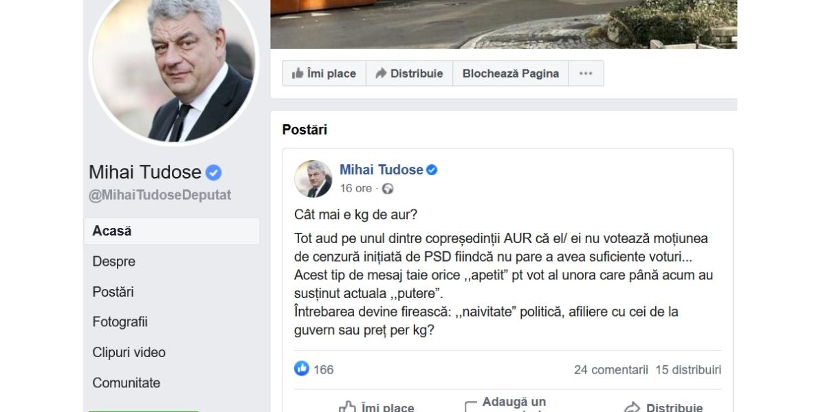 Europarlamentarul PSD Brăila, Mihai Tudose, este de părere că liderii AUR s-au lăsat convinși de actuala putere să nu susțină moțiunea PSD împotriva Guvenului Florin Cîțu. Acesta a postat un comentariu pe rețelele de socializare cu titlul ”Cât mai e kg de aur?”, acuzând copreședinții AUR de ”naivitate” politică sau afiliere cu ”cei de la guvern”.