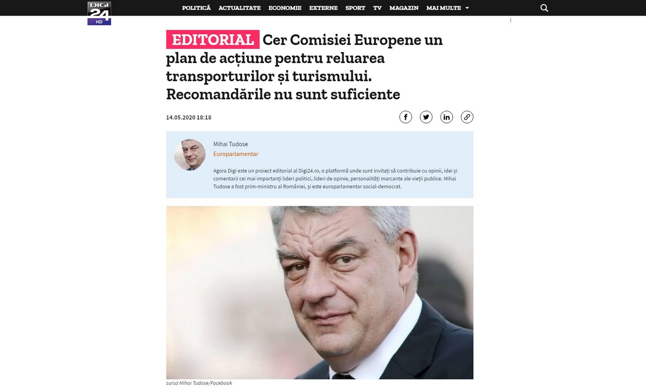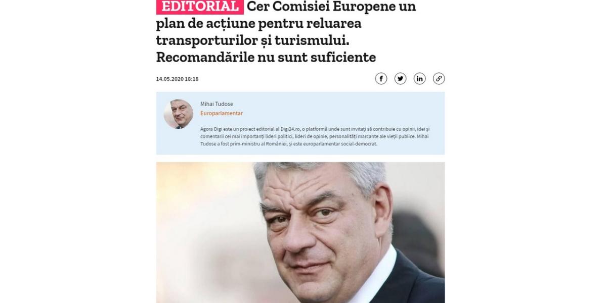 * europarlamentarul PSD Brăila, Mihai Tudose, a afirmat în cadrul unui editorial publicat de Digi24.ro, că recomandările din partea Comisiei Europene nu sunt suficiente în acest moment * acesta a precizat că este nevoie de un plan de acțiune, astfel încât să fie reluate activitățile de transport și cele turistice într-o formă potrivită contextului actual