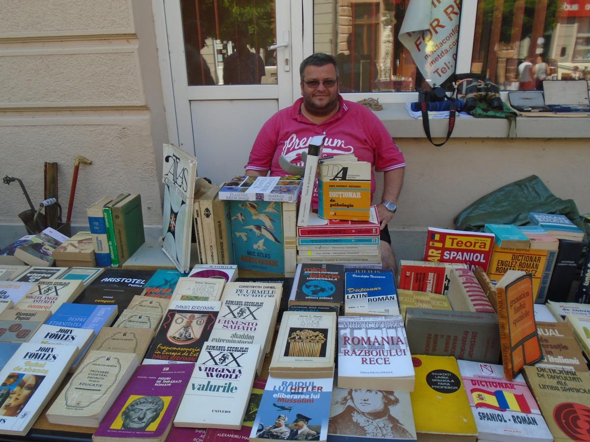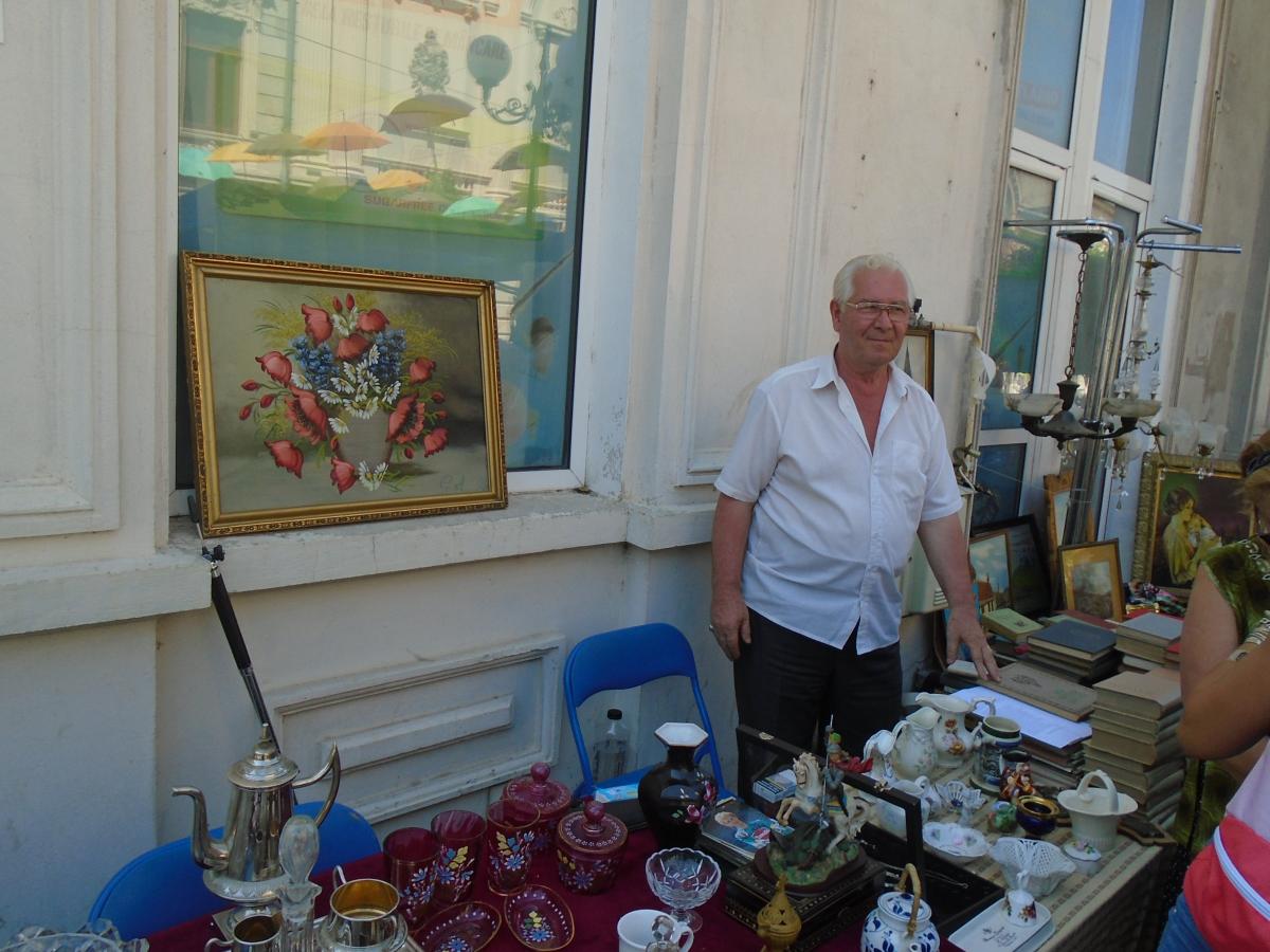 Vechi negustor de antichităţi, brăileanul Costel Anuţoiu expune, chiar vizavi de teatru, tablouri pictate, cărţi, discuri şi argintărie, precum şi mobilier din lemn masiv. Alături, anticarul Ionel Bianu vinde cărţi, aşa cum face de o viaţă-ntreagă. Se bucură nespus când vin brăilenii să-l întrebe despre cărţi.