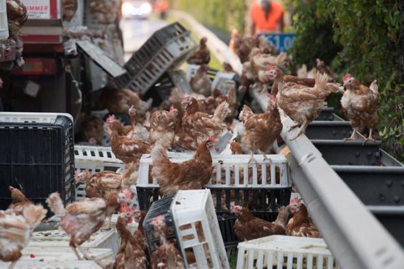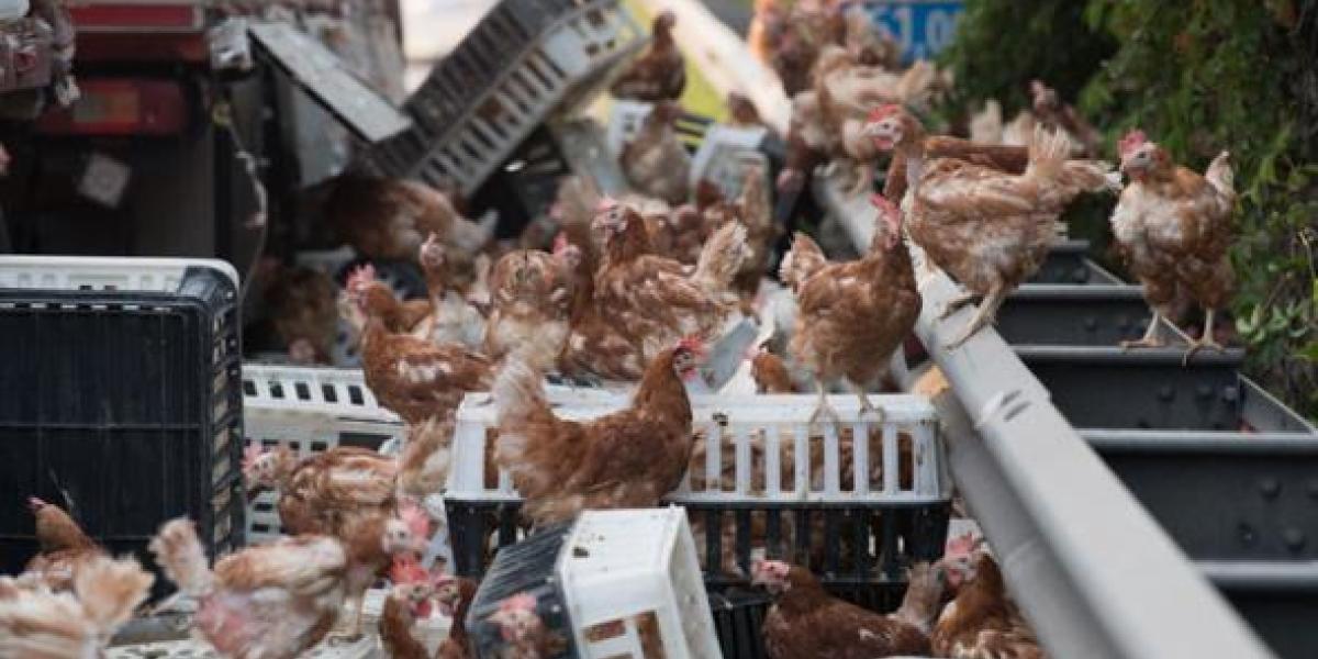 „Cutii în care se aflau animale moarte şi rănite s-au împrăştiat pe o rază de 160 de metri, în timp ce mii de găini au fugit pe şosea, pe ambele sensuri”, a anunţat poliţia.