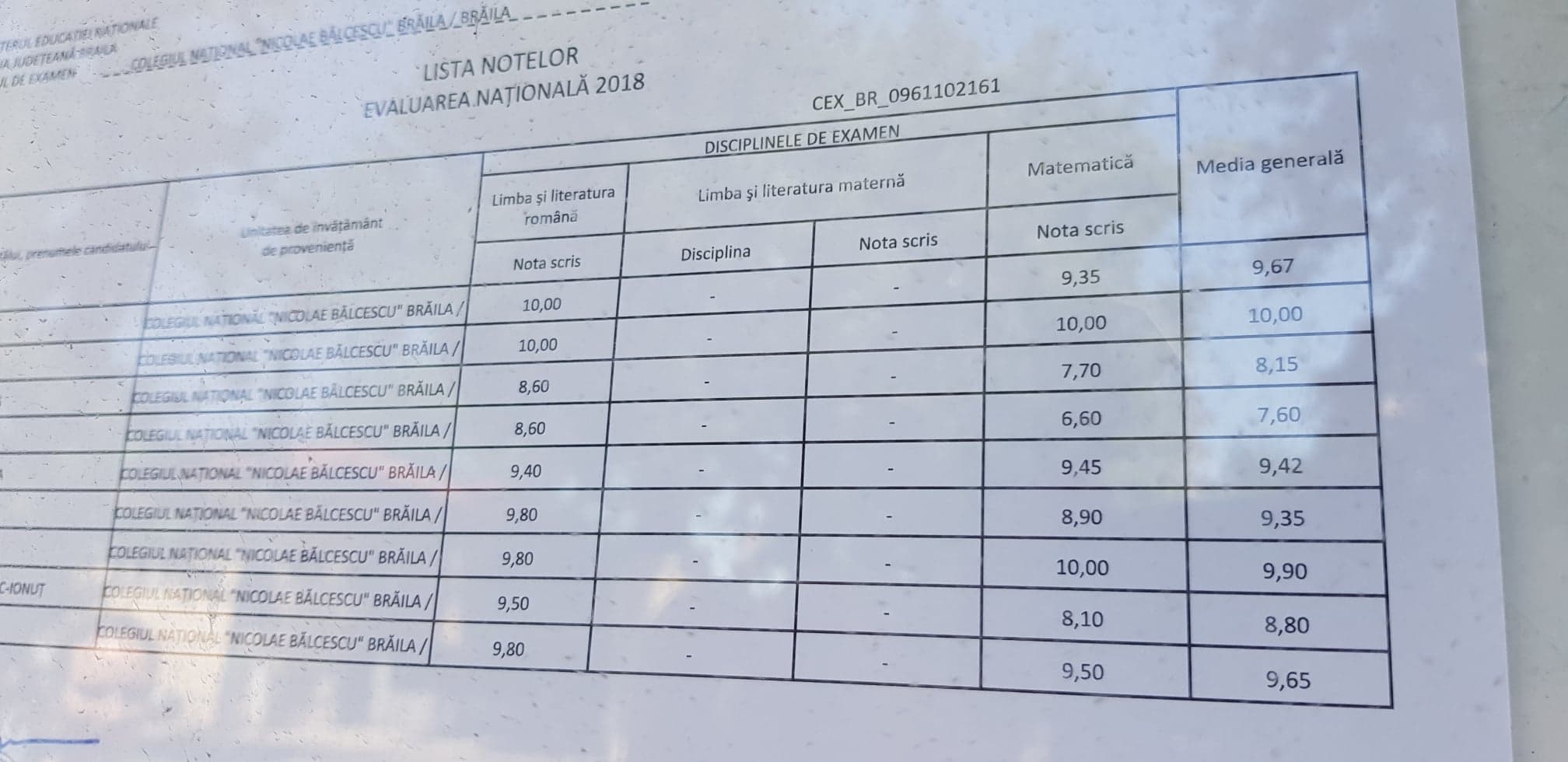 Anul acesta, 10 elevi brăileni au reușit să obțină media perfectă la examenele naționale. La Evaluarea Națională, s-au înregistrat nouă medii maxime, “decarii” fiind: Olivia-Ingrid Androniu, Maria Iordache și Daria Alexia Miron de la Școala “M. Eminescu”, Ana-Maria Botea, Dragoș Ionuț Coticeru și Sandra Maria Păiș de la Colegiul “N. Bălcescu”, Ana Cristina Iordache și Iulia-Andreea Lovin de la Școala “I. Creangă”, Anca Georgiana Moise de la Colegiul “Gh. M. Murgoci”. La Bacalaureat, un singur candidat a obținut media 10. Este vorba despre Maria Nelia Grădeanu, absolventă a Colegiului “Murgoci”.