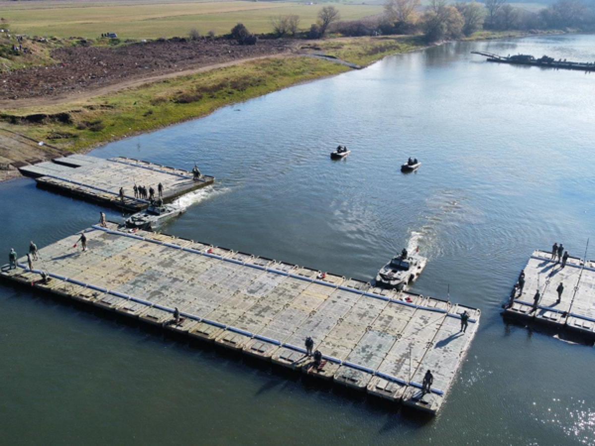 • geniștii au oferit sprijin pentru traversarea unui curs de apă, construind un pod din pontoane care a permis trecerea în siguranță a forțelor participante • exercițiul reunește peste 5.000 de militari din 10 state aliate, inclusiv România, cu 1.200 de mijloace tehnice de luptă - tancuri și transportoare blindate