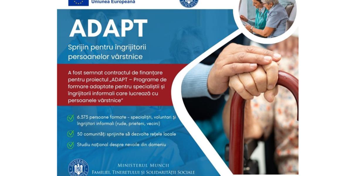 Săptămâna trecută, Ministerul Muncii, Familiei, Tineretului și Solidarității Sociale (MMFTSS) a semnat contractul de finanțare pentru proiectul „ADAPT - Programe de formare adaptate pentru specialiștii și îngrijitorii informali care lucrează cu persoanele vârstnice”, un demers strategic menit să răspundă unei nevoi importante din societatea românească: creșterea calității și accesibilității îngrijirii pentru persoanele vârstnice.