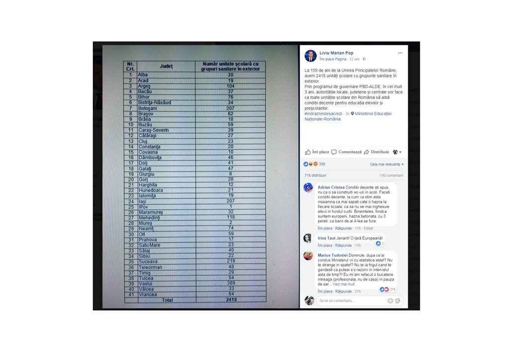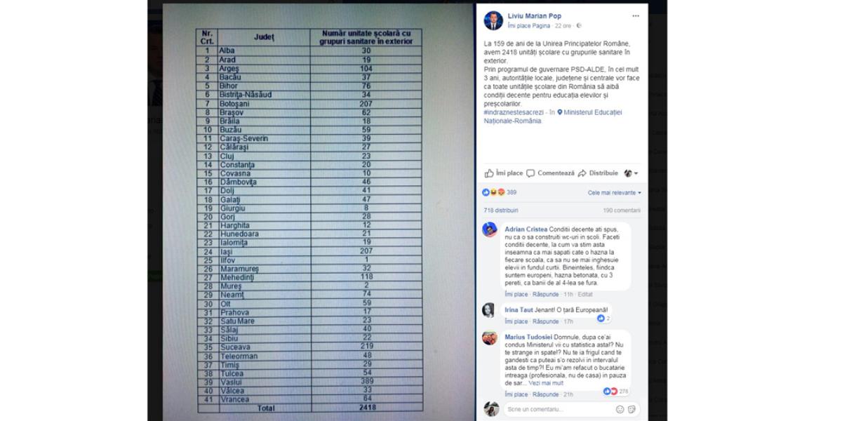 Chiar de Ziua Micii Uniri, ministrul Educaţiei Liviu Pop a postat pe Facebook lista cu numărul şcolilor din România care au grupuri sanitare în exterior, adică în curte. “La 159 de ani de la Unirea Principatelor Române avem 2.418 unităţi şcolare cu grupurile sanitare în exterior. În cel mult 3 ani, prin programul de guvernare PSD-ALDE, autorităţile locale, judeţene şi centrale vor face ca toate unităţile şcolare din România să aibă condiţii decente pentru educaţia elevilor şi preşcolarilor”, se mai arată în descrierea ce însoţeşte lista. Sunt nu mai puţin de 2.418 şcoli cu WC-uri în curte, în toată ţara.