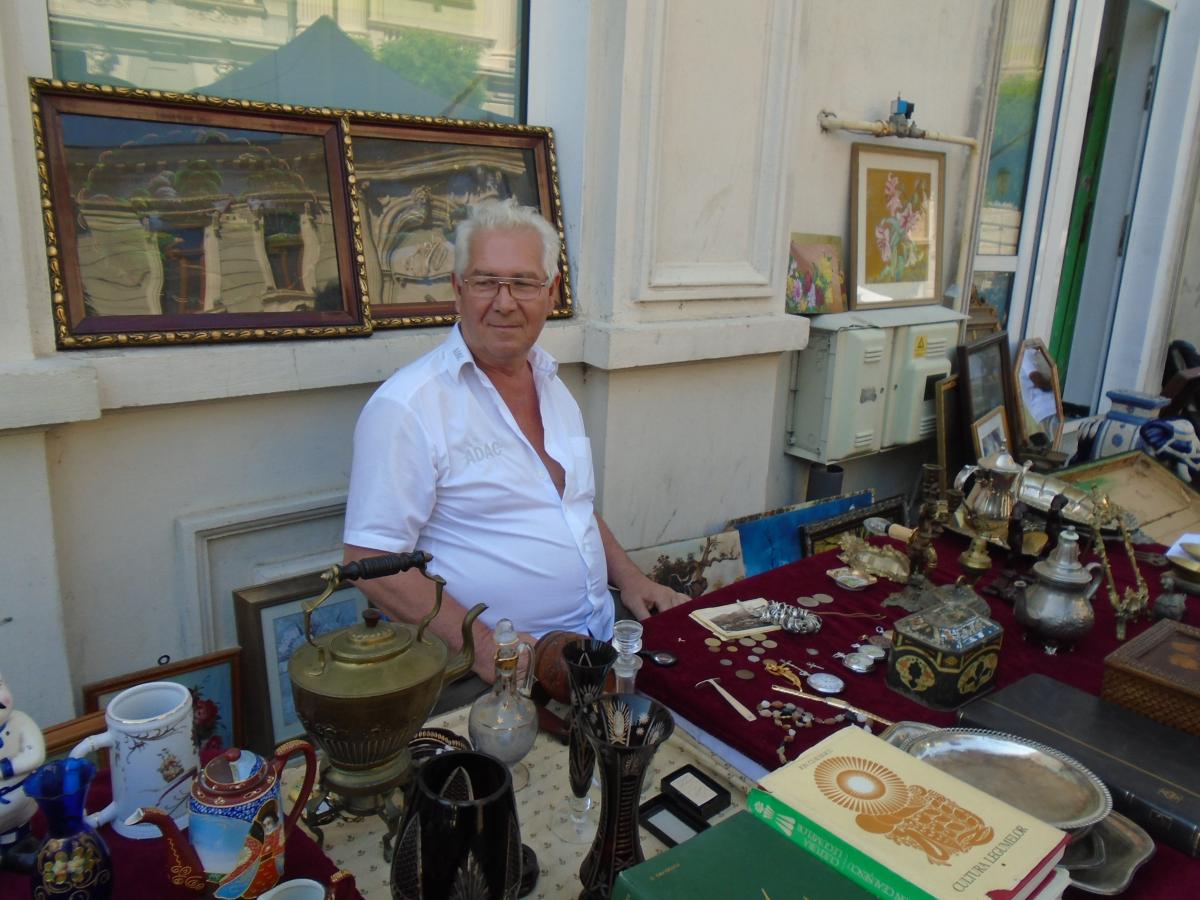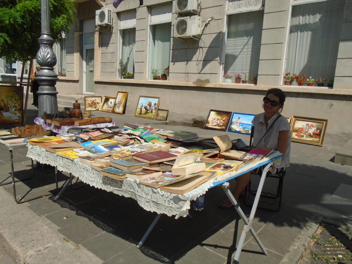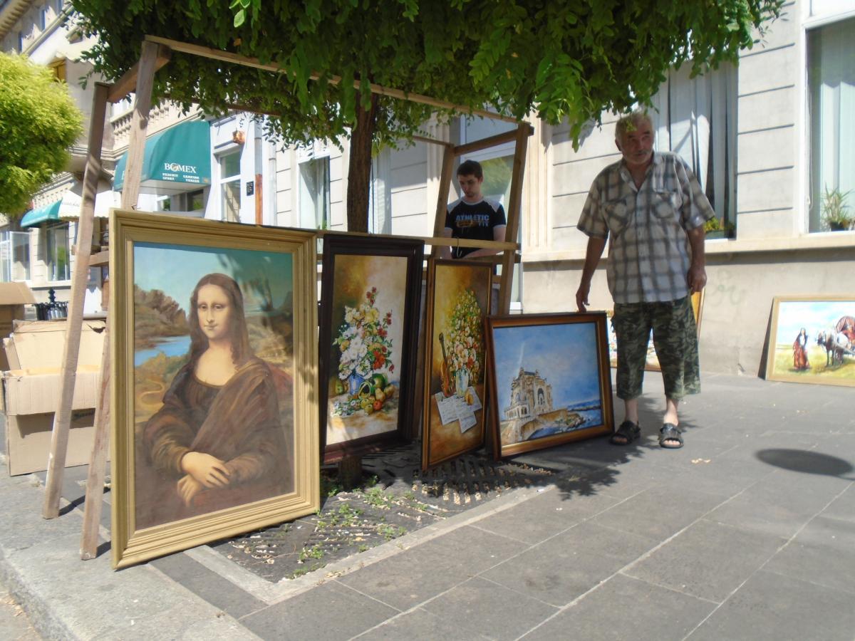 Vizavi, şi-a aşezat taraba cu antichităţi Costică Anuţoiu, anticar brăilean cu experienţă. Alături se află Ionel Bianu, cu sutele de cărţi mai vechi şi mai noi, iar mai departe puteţi admira porţelanurile lui Cristian Coman. În faţa teatrului, se află şi artistul plastic Costel Cimpoiaşu, sosit tocmai din Botoşani, ca să expună o replică a vestitei Mona Lisa. “Am făcut şapte ore pe drum, dar nu-mi pare rău. Am adus o mulţime de picturi pe pânză la Brăila”, ne-a spus artistul botoşănean, care transformase strada în salon de artă.