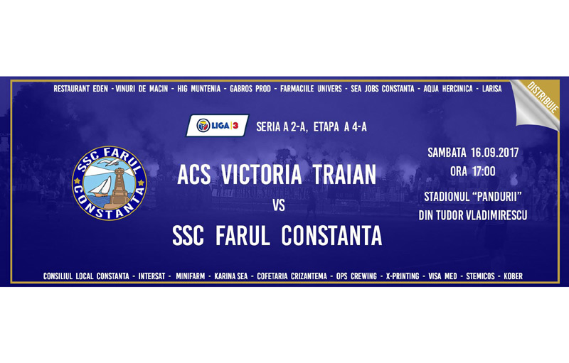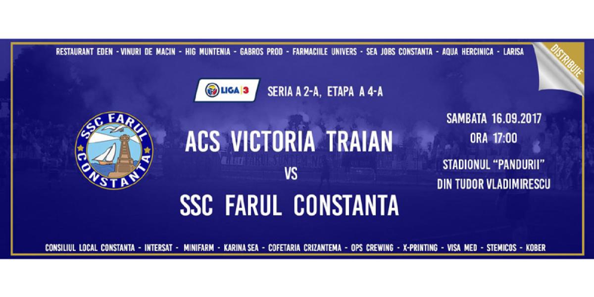 Astăzi, de la ora 17.00, în cadrul etapei a 4-a, a Ligii a III-a, Victoria Traian va juca pe teren propriu în compania principalei candidate la promovare în Liga a II-a, Farul Constanţa. Misiunea jucătorilor pregătiţi de Nicu Rotaru este una dificilă, ţinând cont de valoarea formaţiei vizitatoare pregătite de un tehnician cu renume din fotbalul românesc, Petre Grigoraş.