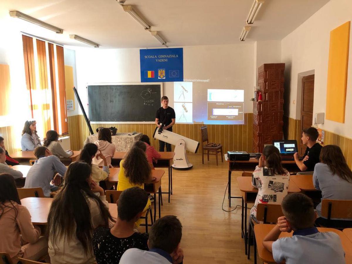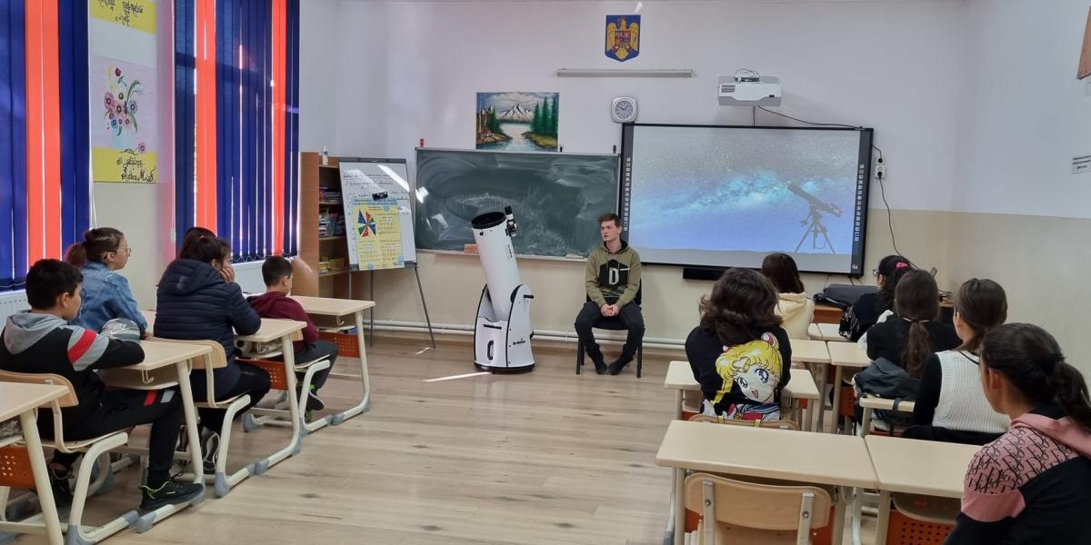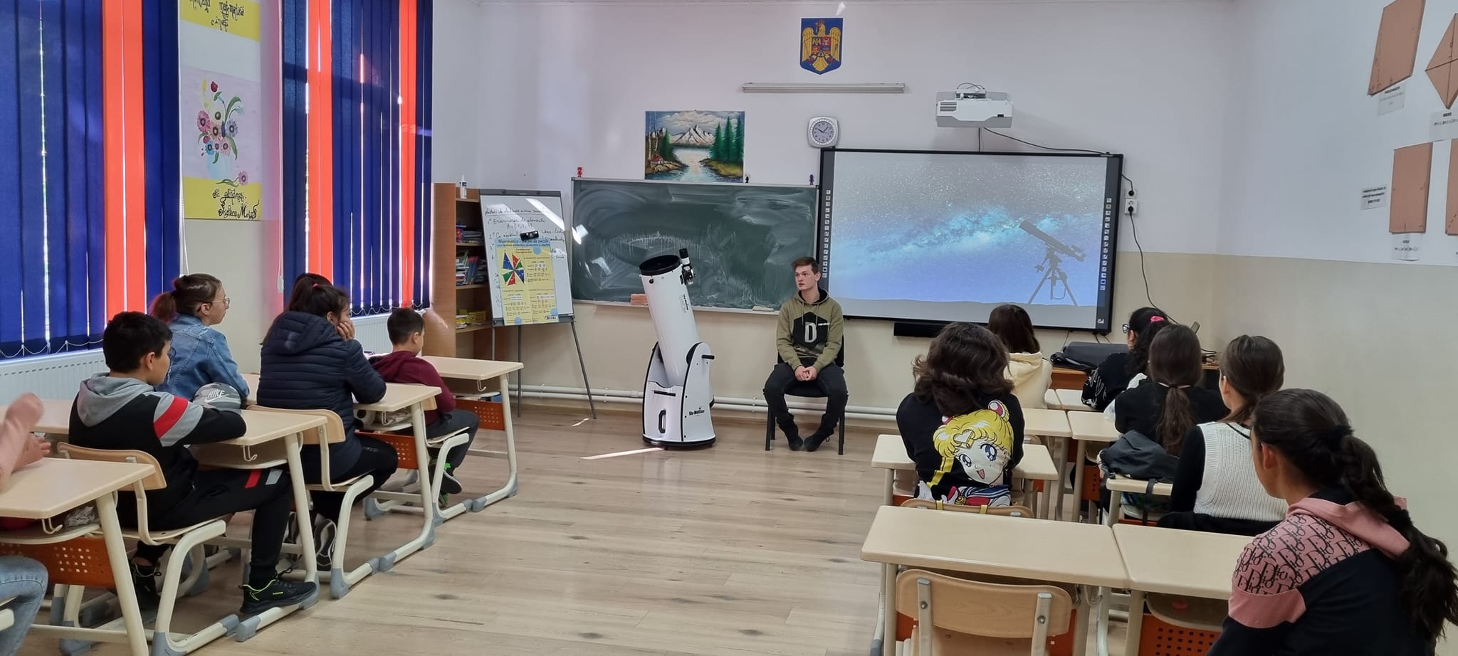 - Ideal, proiectul este pentru cei de gimnaziu, dar dacă cei mici sunt curioși, vorbesc și cu cei mici. Nu este absolut nicio problemă! Eu îi primesc și lucrez cu toți, nu există o limită de vârstă. Intru în clasă cu telescopul, cu laptopul și este pur și simplu o discuție liberă în care vine un copil de nicăieri (eu sunt tot un copil) și le spune: «Bună tuturor! Am venit să vă vorbesc despre atronomie. Ce e aia?». Și practic le explic ce este astronomia, istoria astronomiei, constelații, lucruri mai mult de cultură generală. Le aduc în față pasiunea mea. Și nu le vorbesc neapărat din perspectiva «trebuie să învățați aceste lucruri, să știți constelațiile». Nu mă interesează asta! Însă vreau ca ei să vadă că astronomia este pasiunea mea, am muncit pentru ea și astronomia m-a ajutat în viață. La fel de bine pot și ei să își găsească o pasiune, oricare ar fi ea, de la tractorist la bucătar, orice, să munceacă pentru ea și să reușească. Și le doresc să aibă norocul ca acea pasiune să se intersecteze puțin cu școala, astfel încât să găsească ceva cu adevărat semnificativ în școală și să profite de acești ani la maxim. Apoi, îi îndemn să aibă curaj, să nu desconsidere puterea pe care o au. «Indiferent dacă sunteți de la țară, indiferent câți bani aveți, indiferent copiii cui sunteți, aveți curaj și veți reuși». Acesta este mesajul pe care eu îl inserez în prezentarea mea. Astronomia este doar un pretext pentru a încuraja alți copii să-și găsească o pasiune.