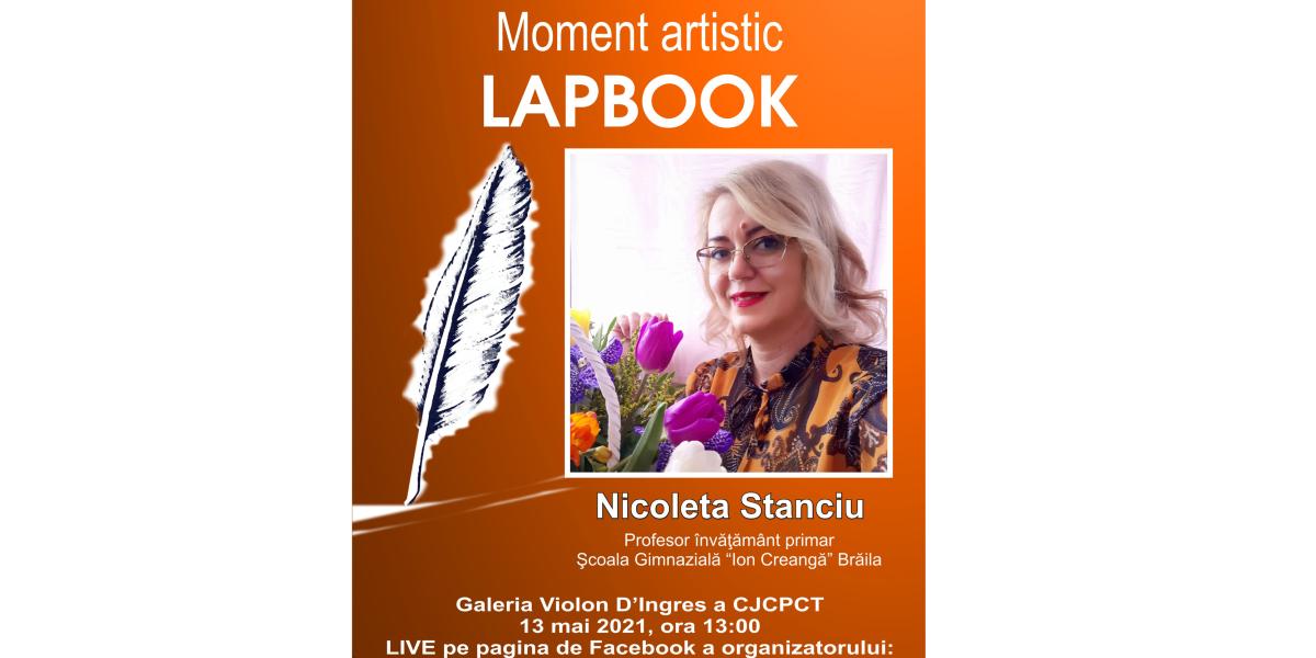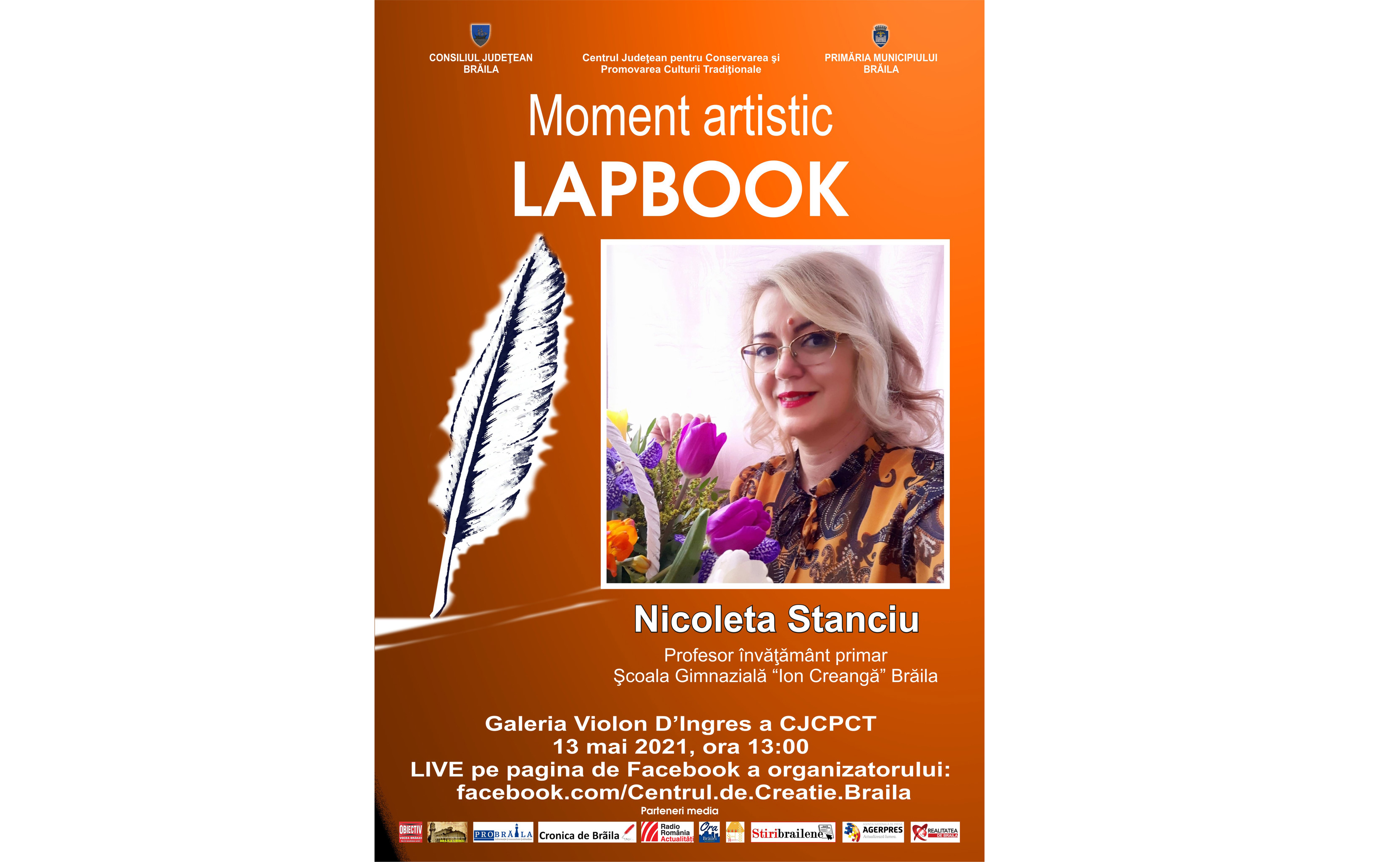 Astfel, potrivit comunicatului de presă remis de organizator, Consiliul Județean Brăila, cu sprijinul Primăriei Municipiului și Centrul Județean pentru Conservarea și Promovarea Culturii Tradiționale (Centrul de Creație Brăila) îi invită pe brăileni să participe joi, 13 mai, începând cu ora 13.00, la evenimentul cultural intitulat "Moment artistic -Lapbook", alături de Nicoleta Stanciu, prof. învățământ primar la Școala Gimnazială "Ion Creangă".