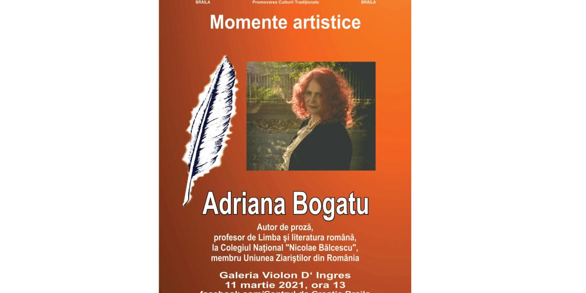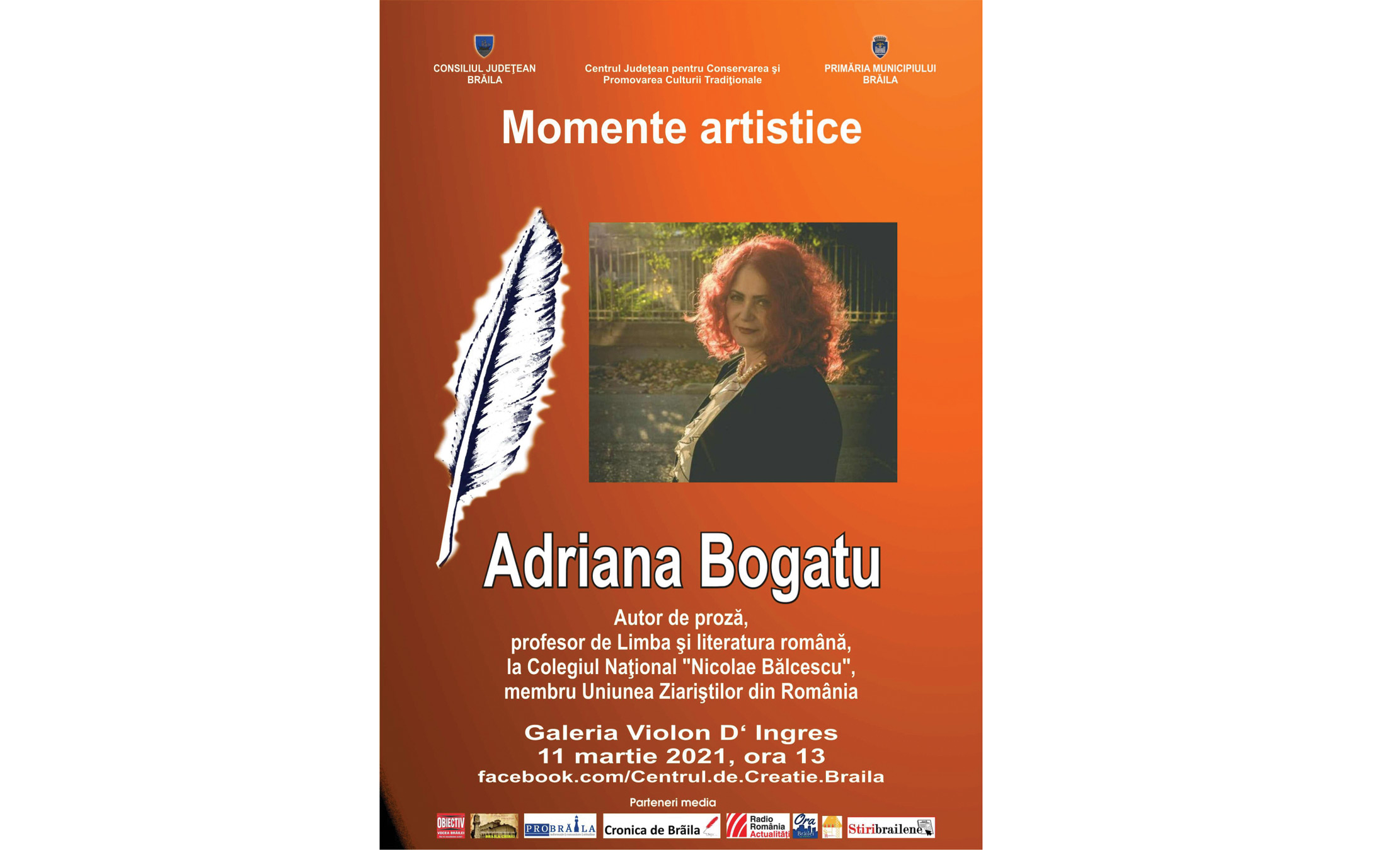 Centrul Județean pentru Conservarea și Promovarea Culturii Tradiționale Brăila are ca invitat special, în data de 11 martie, la Momentul artistic de la ora 13.00, pe Adriana Bogatu, autor de cronici teatrale și proză, profesor de Limba și literatura română la Colegiul Național Nicolae Bălcescu, membru al Uniunii Ziariștilor din România.