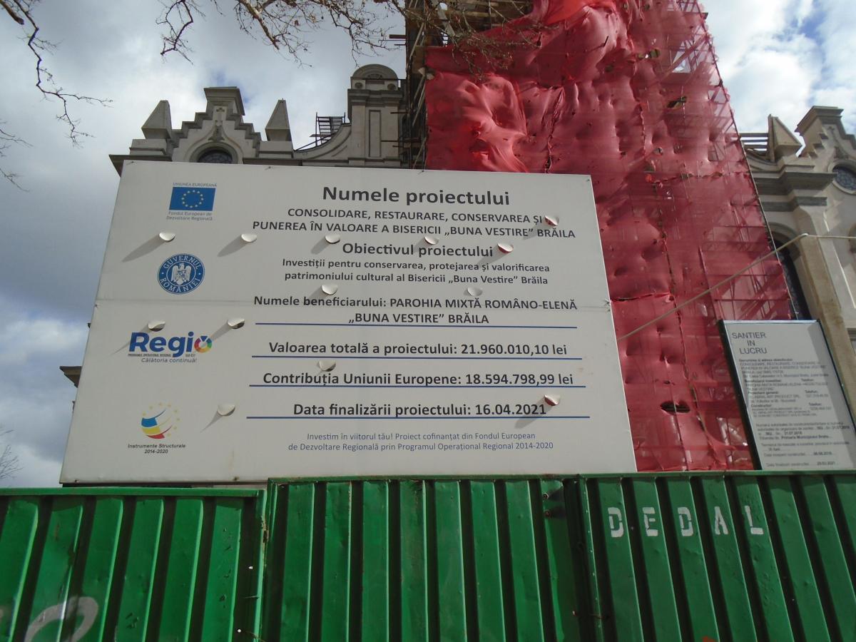 Primul monument aflat în ample lucrări de restaurare, consolidare, conservare şi punere în valoare este Biserica Greacă “Buna Vestire” amplasată în Centrul Vechi (Calea Călăraşilor nr. 3) şi ctitorită la 1863 - cu acordul domnitorului Alexandru Ioan Cuza - de 300 de familii de greci înstăriţi din municipiul Brăila. Pictată de Gheorghe Tattarescu, în a doua jumătate a sec. XIX, şi construită cu marmură de Carrara, biserica este în prezent restaurată de specialişti de top (inclusiv restauratori de piatră. Investiţia este de 21.960.000 lei (din care 18.594.799 lei contribuţia UE), iar lucrările vor fi finalizate până pe data de 16 aprilie 2021.