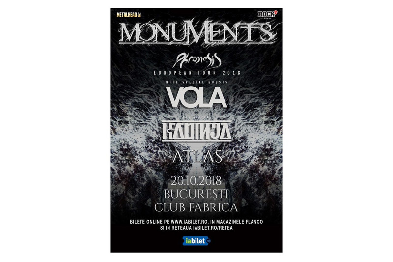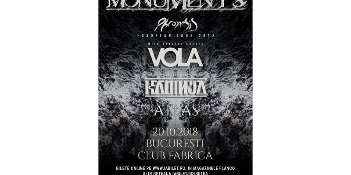 Concert extraordinar cu trupele Monuments şi Vola în weekend la Bucureşti. Show-ul va avea loc sâmbătă, 20 octombrie, de la ora 19:00, în Club Fabrica. Este un concert exclusivist cu doar 350 de bilete în vânzare. În deschidere va cânta trupa de progressive metal din Franţa, Kadinja, precum şi formaţia Atlas din Finlanda. Organizatorii au emis recent un comunicat de presă în care au anunţat programul complet al evenimentului după cum urmează: Open Doors la ora 19:00; Atlas va concerta la 19:15 - 19:45; Kadinja la 20:00 - 20:30; Vola cântă între 20:45 - 21:25, iar Monuments după ora 21:45.